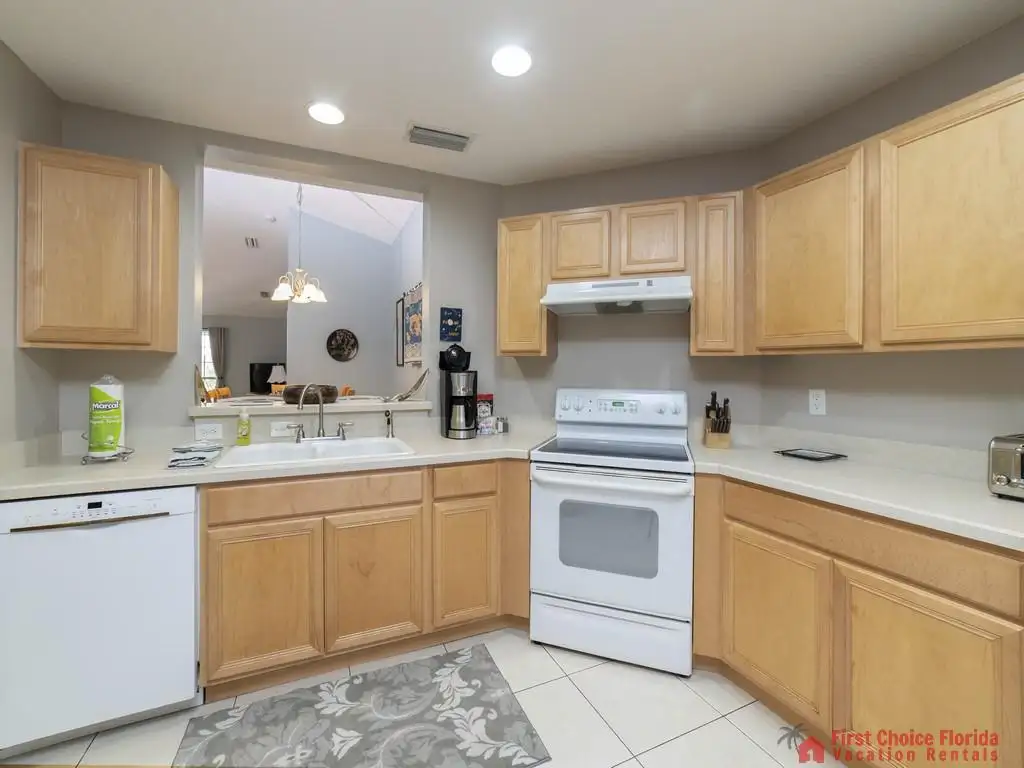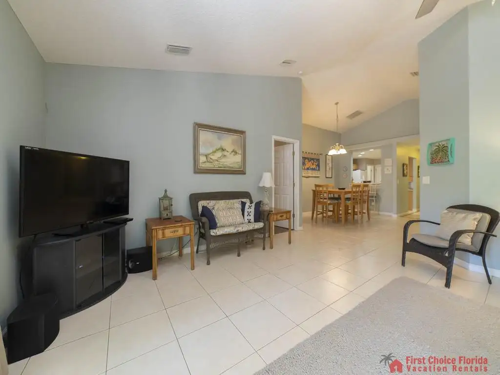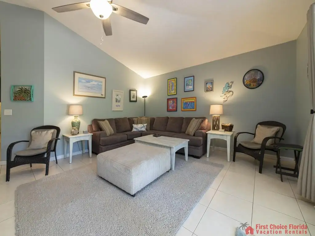 The open floor plan centers around a spacious living area with comfortable seating and a sleeper sofa for additional guests. The fully equipped kitchen features ample counter space, modern appliances, and everything needed for preparing meals at home. Adjacent dining and living spaces allow everyone to gather easily without feeling crowded.