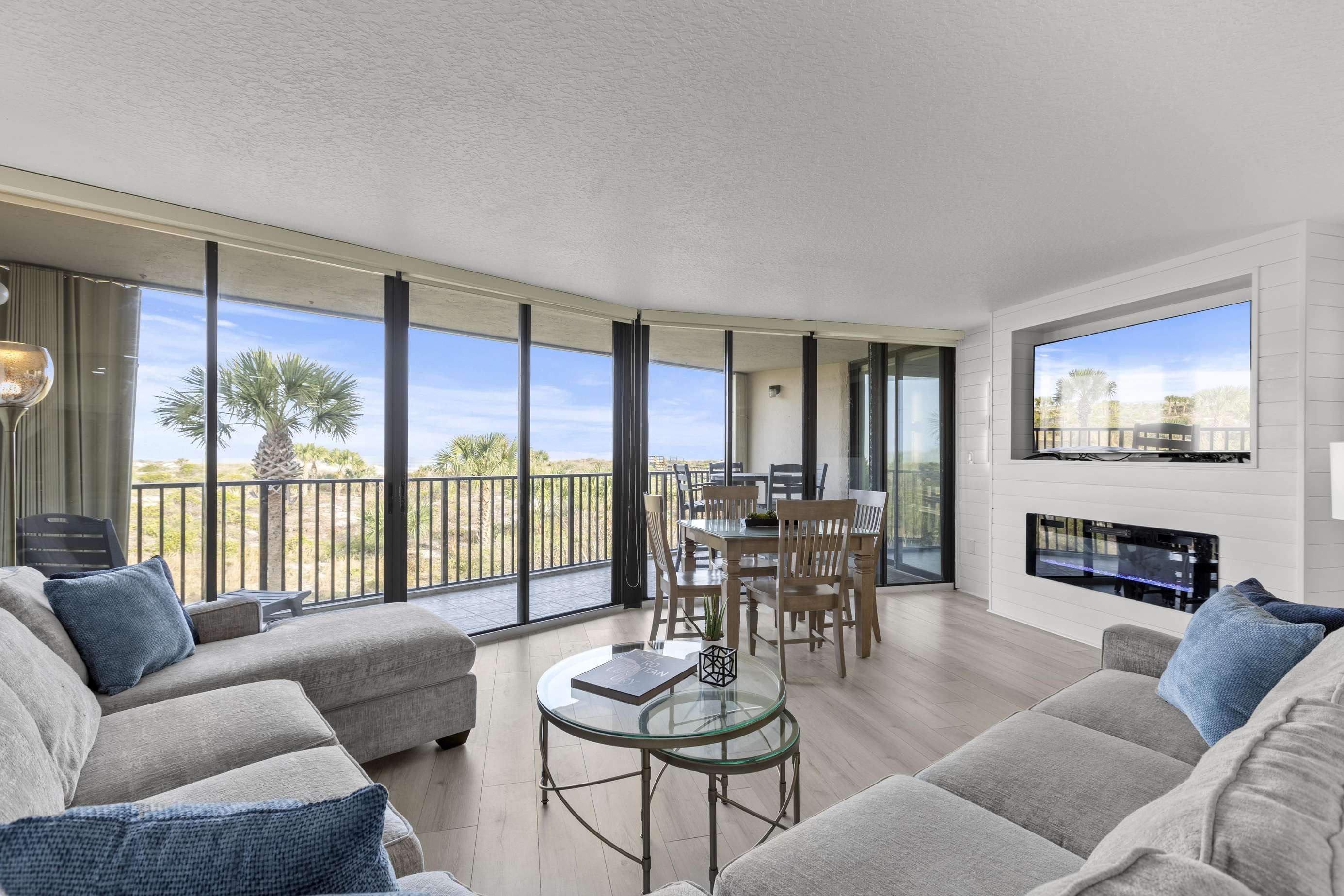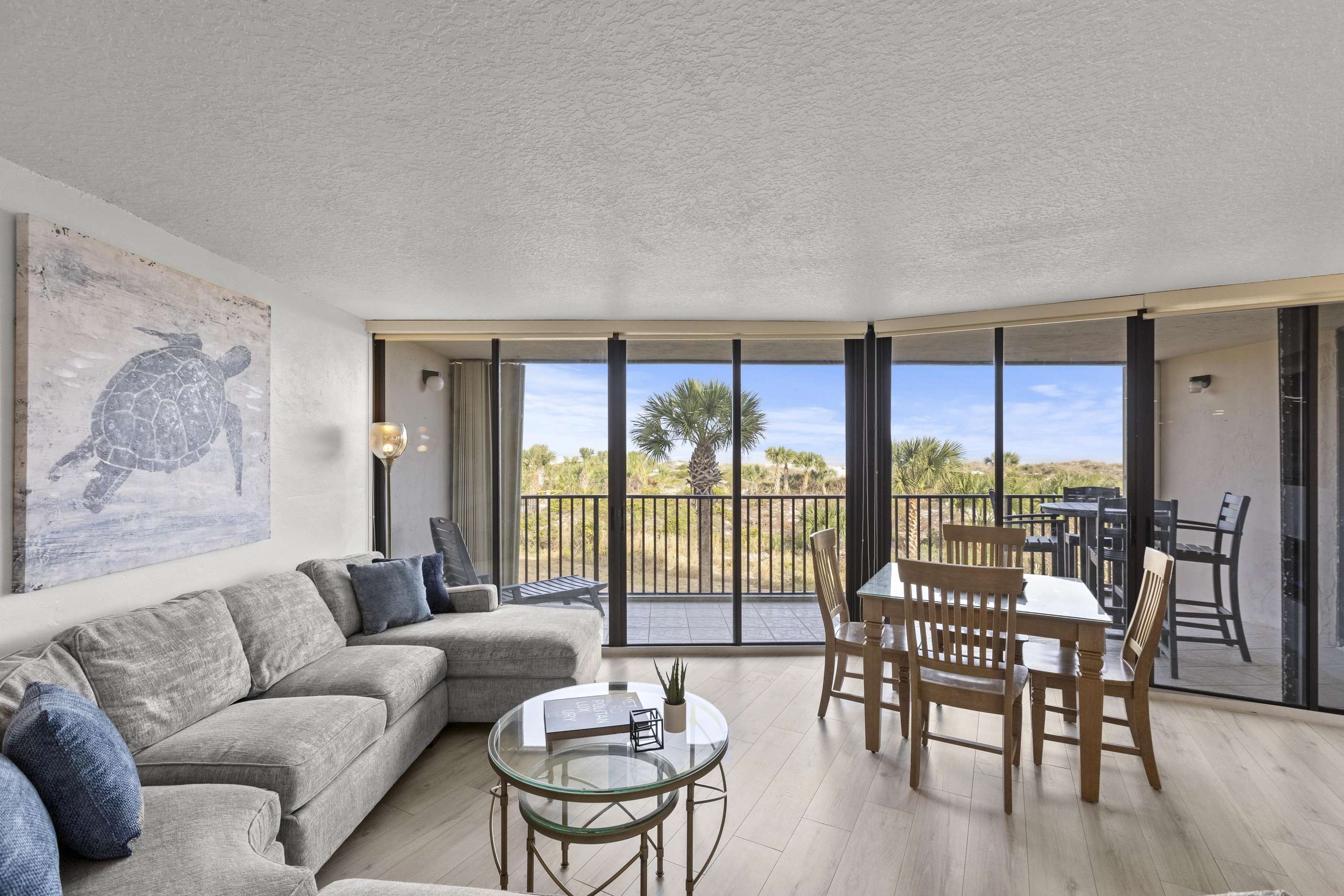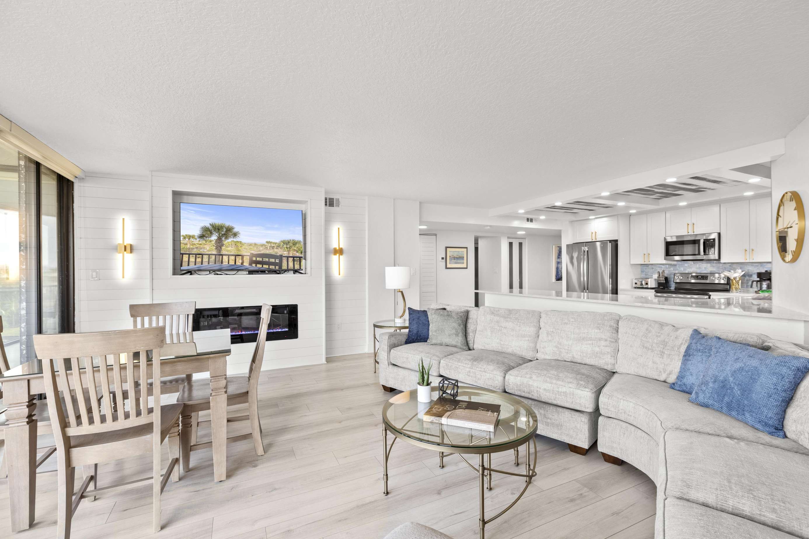 The living room, dining room, and gourmet kitchen also provide far-reaching views of the ocean to the north! The wall of sliding doors opens onto the expansive terrace, while the large sectional sofa offers a comfy vantage point for watching the waves or enjoying the HDTV.