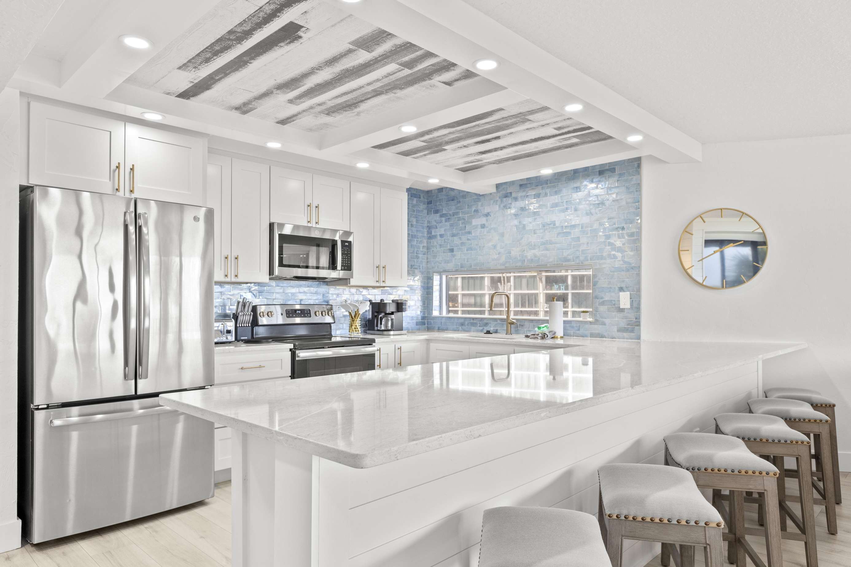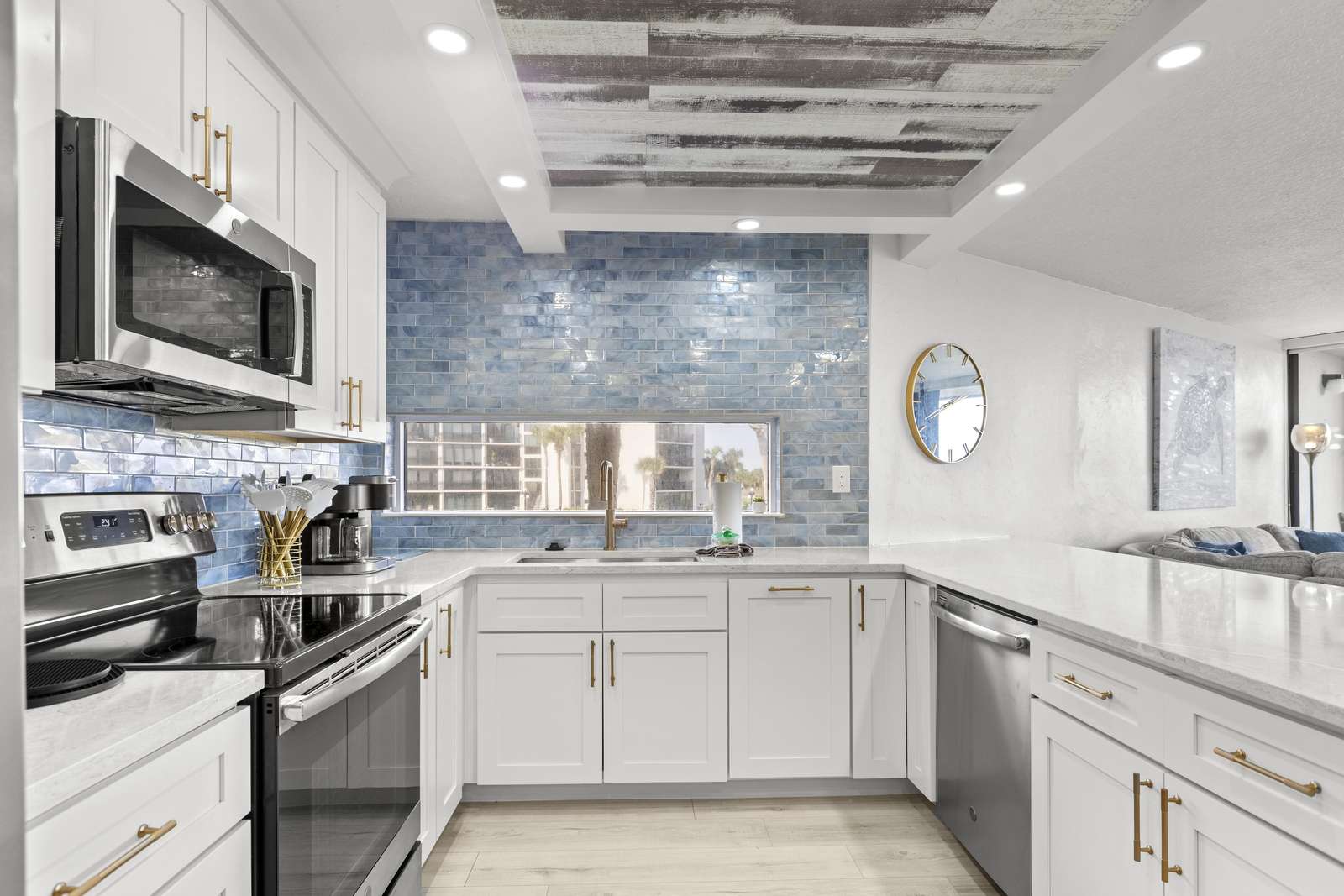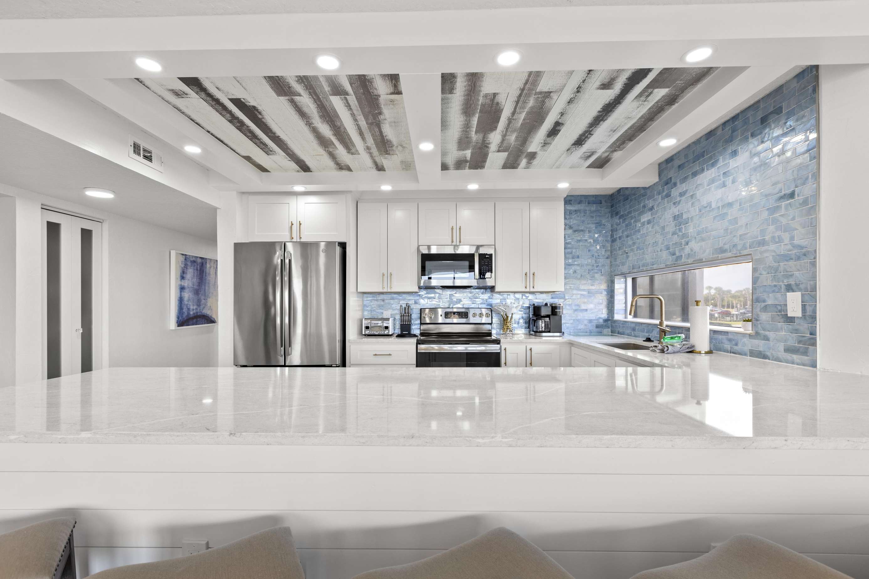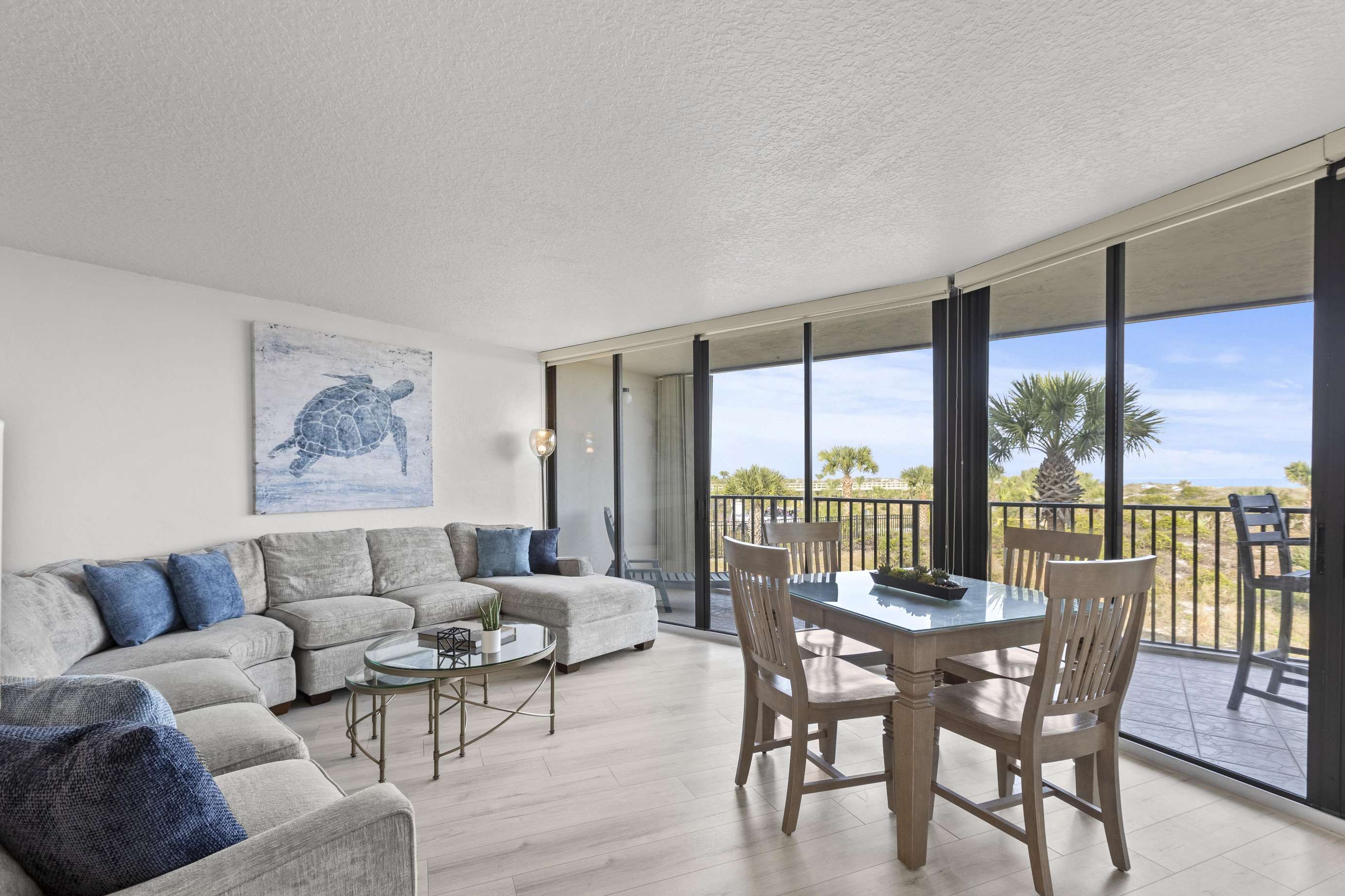 The living room, dining room, and gourmet kitchen also provide far-reaching views of the ocean to the north! The wall of sliding doors opens onto the expansive terrace, while the large sectional sofa offers a comfy vantage point for watching the waves or enjoying the HDTV.
