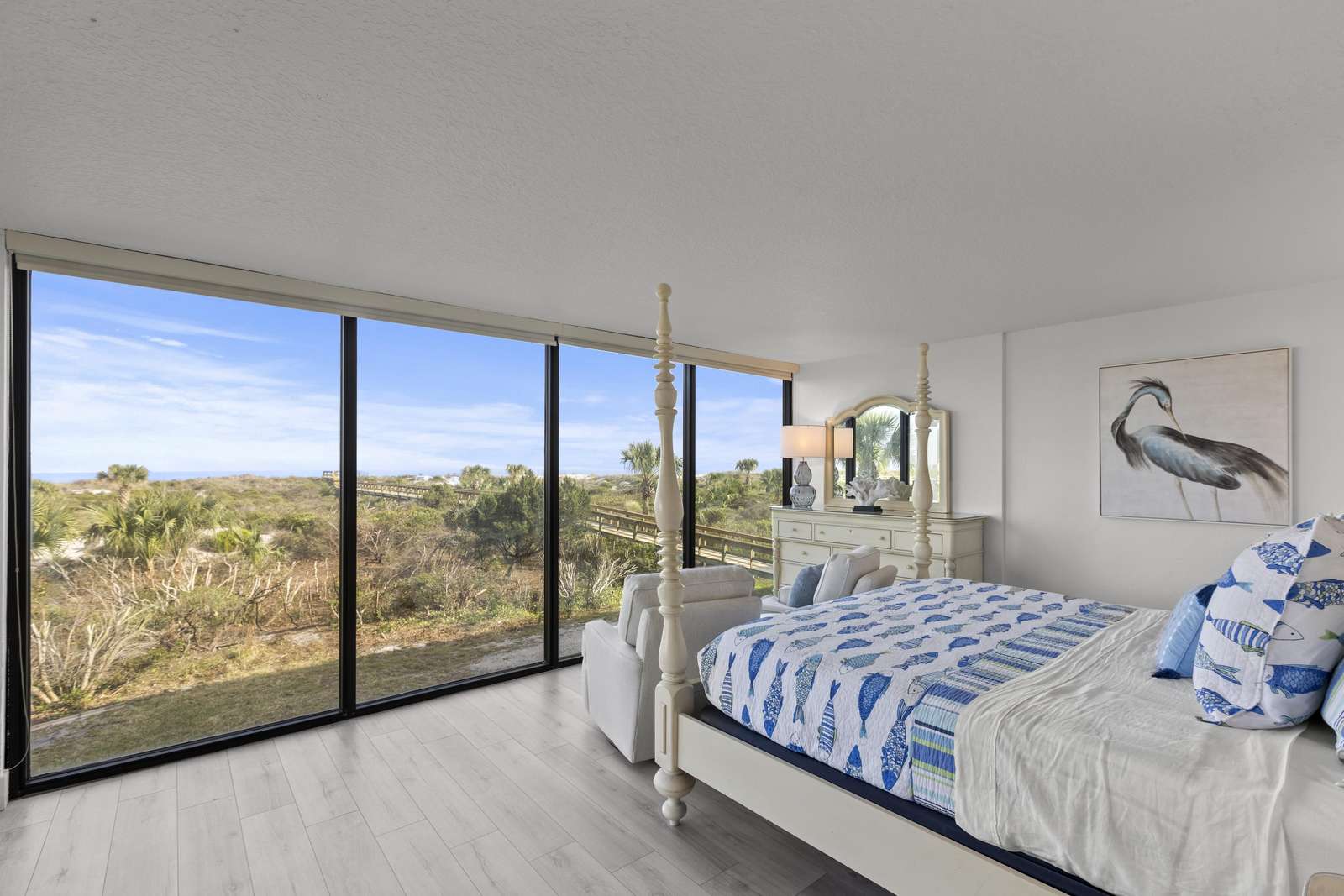 Start your day by waking up to the sunrise through the beautiful floor-to-ceiling windows in the master suite! The king-sized bed faces the windows, providing breathtaking ocean views. A sliding door offers access to the large oceanfront terrace.