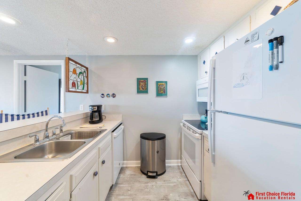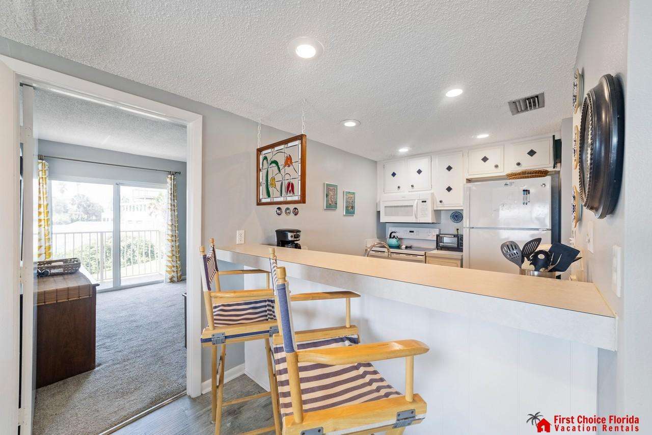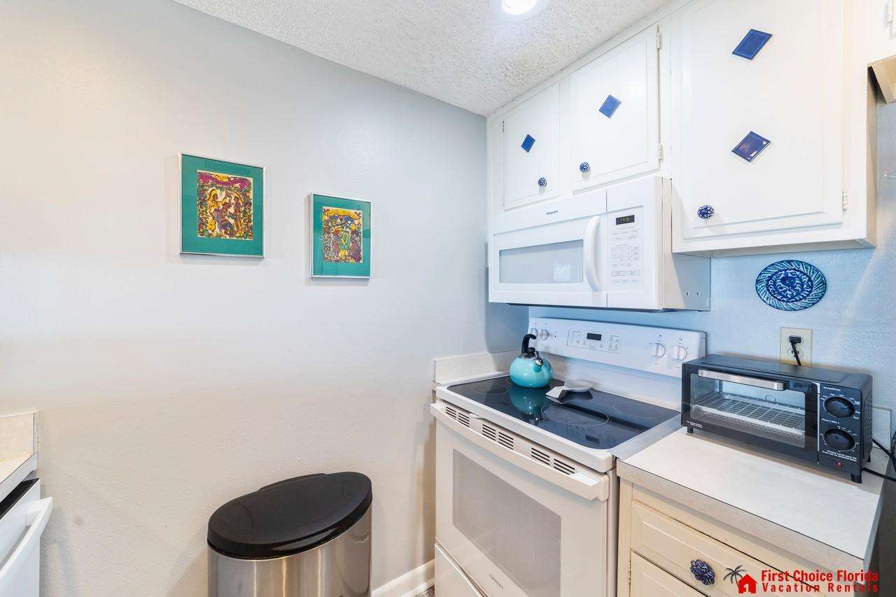 The living space also provides spectacular oceanfront views through the dunes. Mealtime will be a snap in the fully equipped kitchen, which includes a coffee maker, toaster, microwave, oven, and flattop stove—dining space to accommodate everyone.