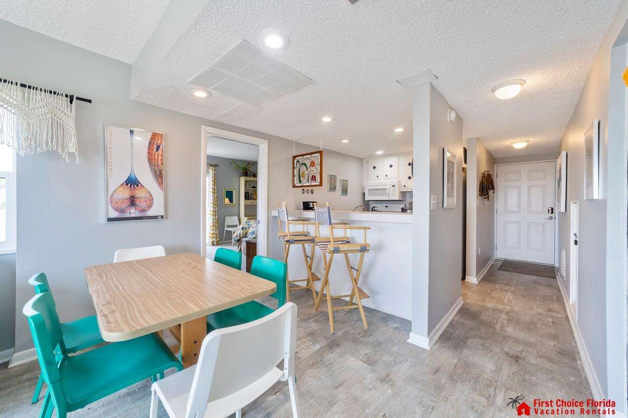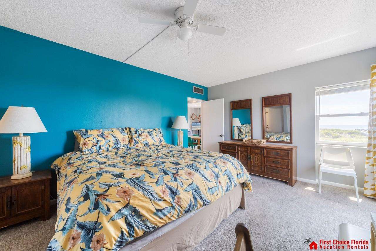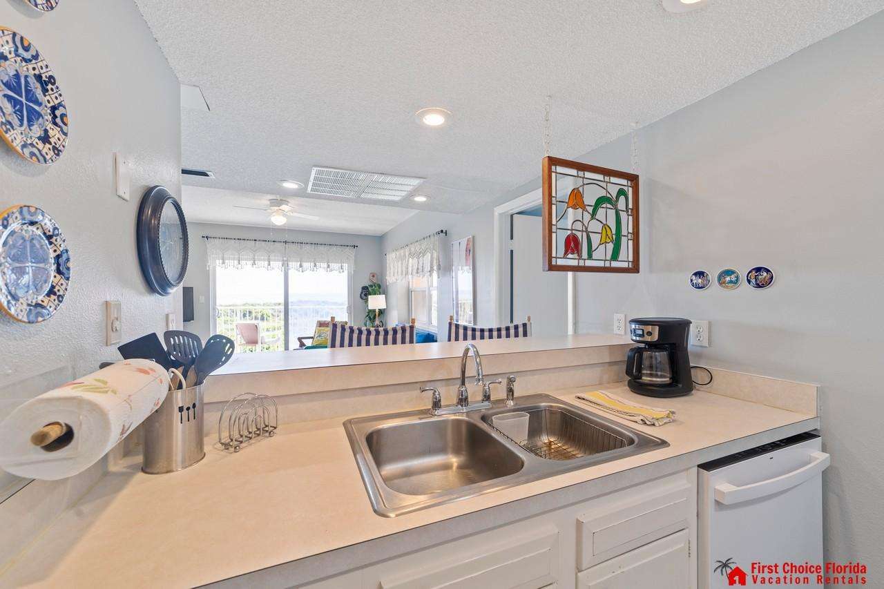 The living space also provides spectacular oceanfront views through the dunes. Mealtime will be a snap in the fully equipped kitchen, which includes a coffee maker, toaster, microwave, oven, and flattop stove—dining space to accommodate everyone.