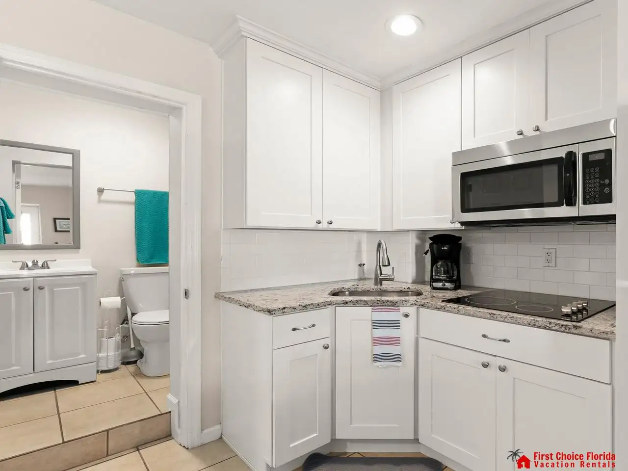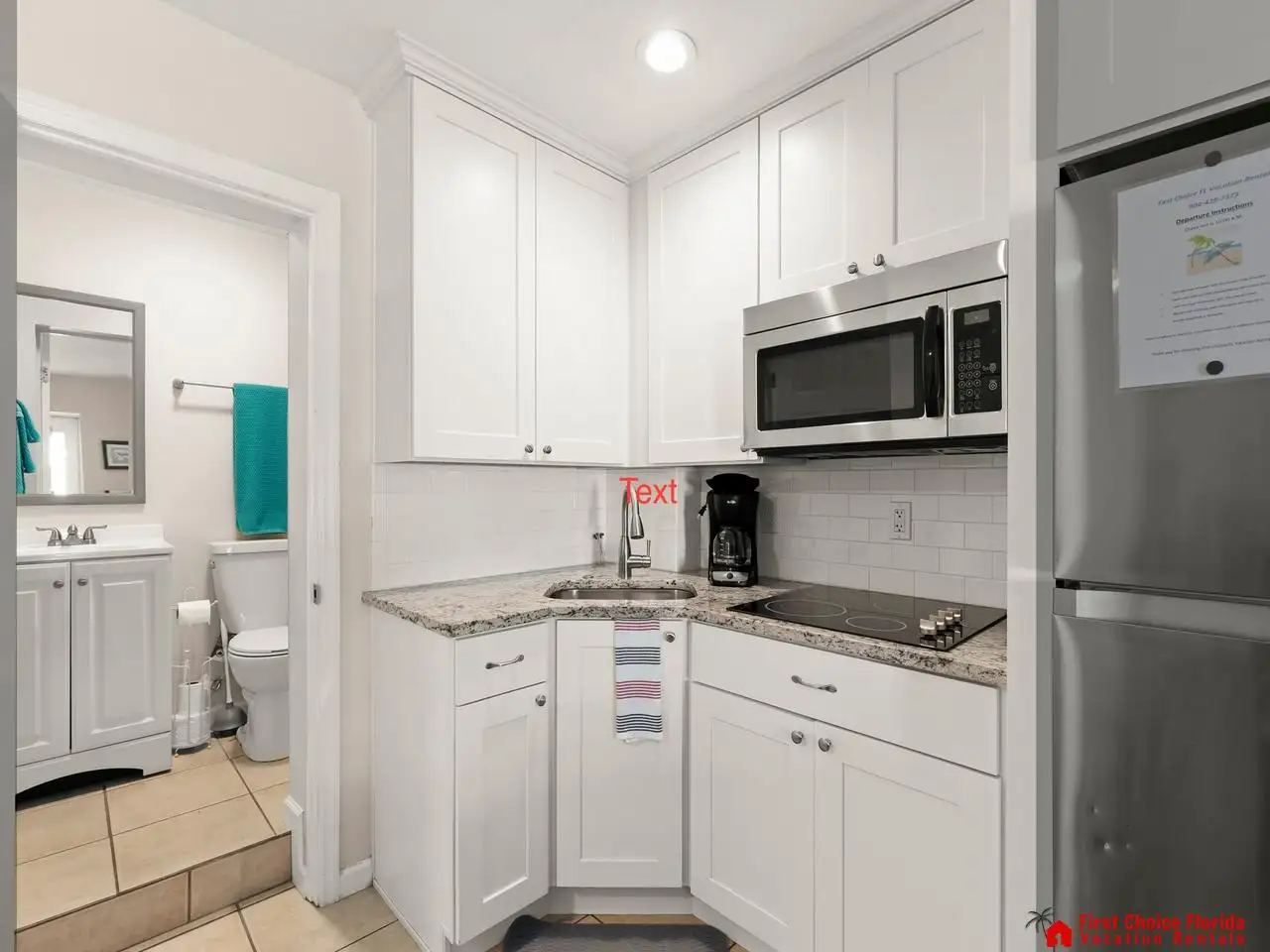 This open concept studio is perfect for your vacation getaway. Conveniently located on the ground floor! Prepare your meals in the beautiful kitchen with top of the line appliances. The studio features a king-sized bed! This unit also has acess to a washer and dryer and a outdoor shower.