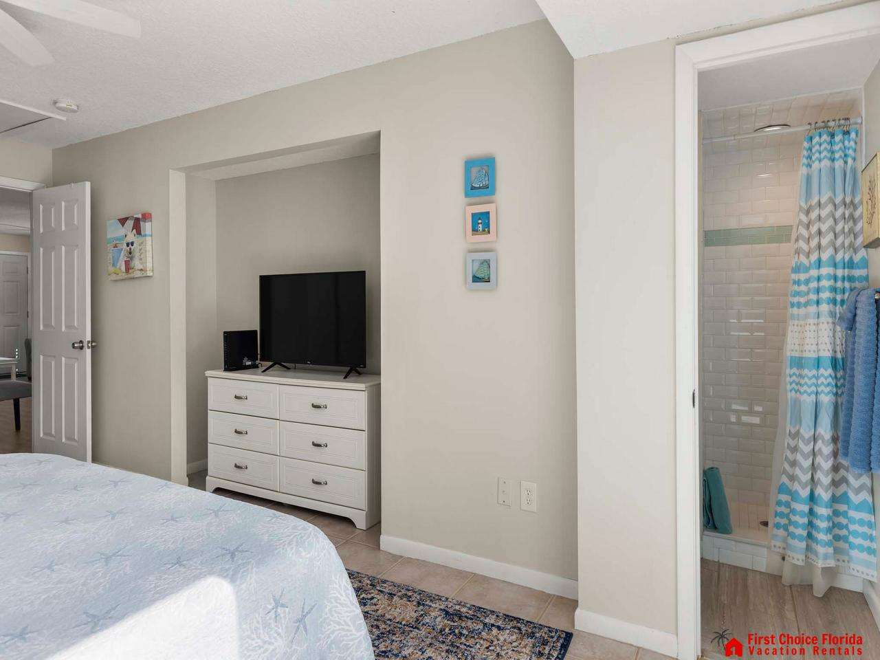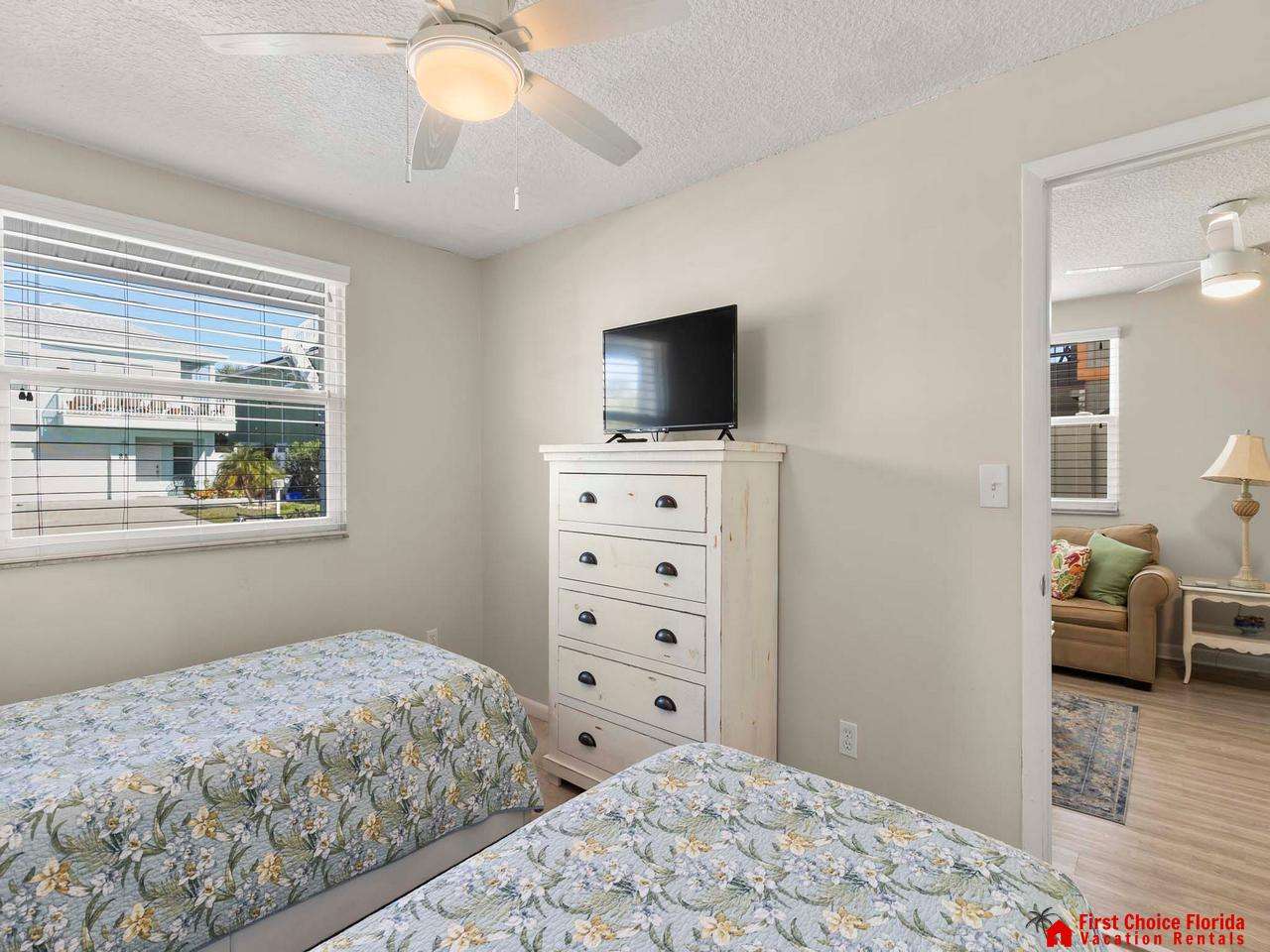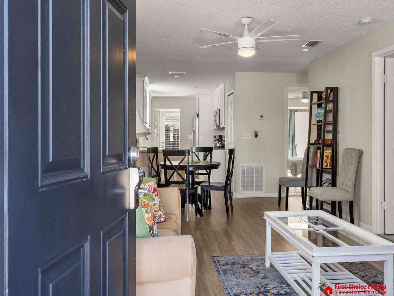This open concept completely remodeled 2 bedrooms / 2 bath flat is perfect for your vacation getaway. Conveniently located on the ground floor! Prepare your meals in the beautiful kitchen with top of the line appliances. The master bedroom features a king-sized bed. The second bedroom has 2 twin-sized beds. Both bedrooms have flat screen TV’s! There is also a queen sleeper sofa in the living room which brings the total occupancy up to 6. This unit also has a dedicated fenced in backyard as well as an outside shower.