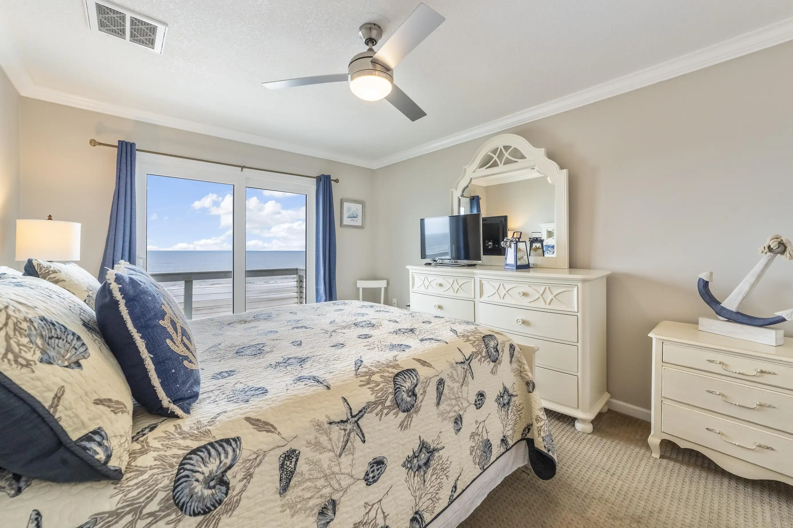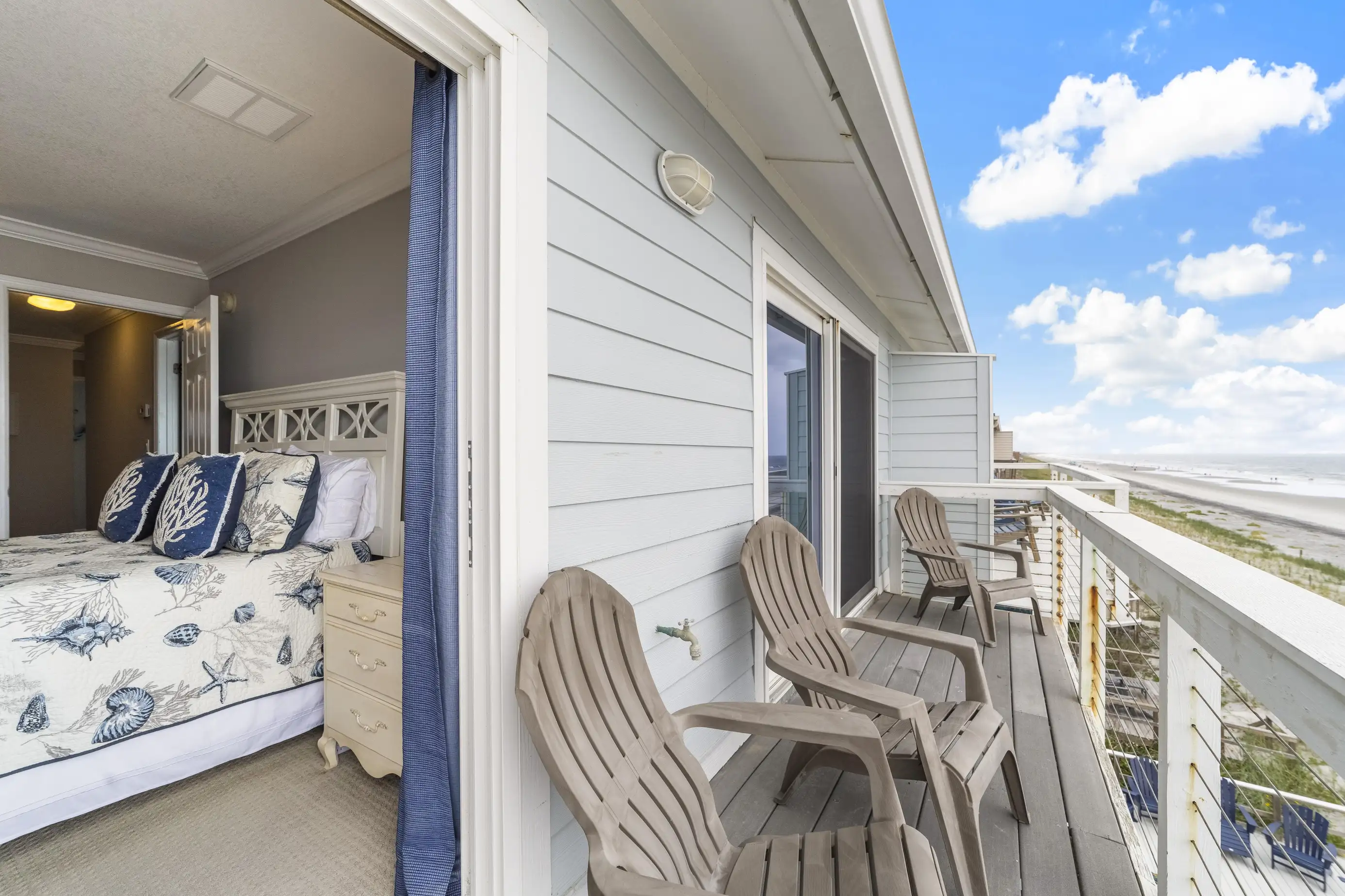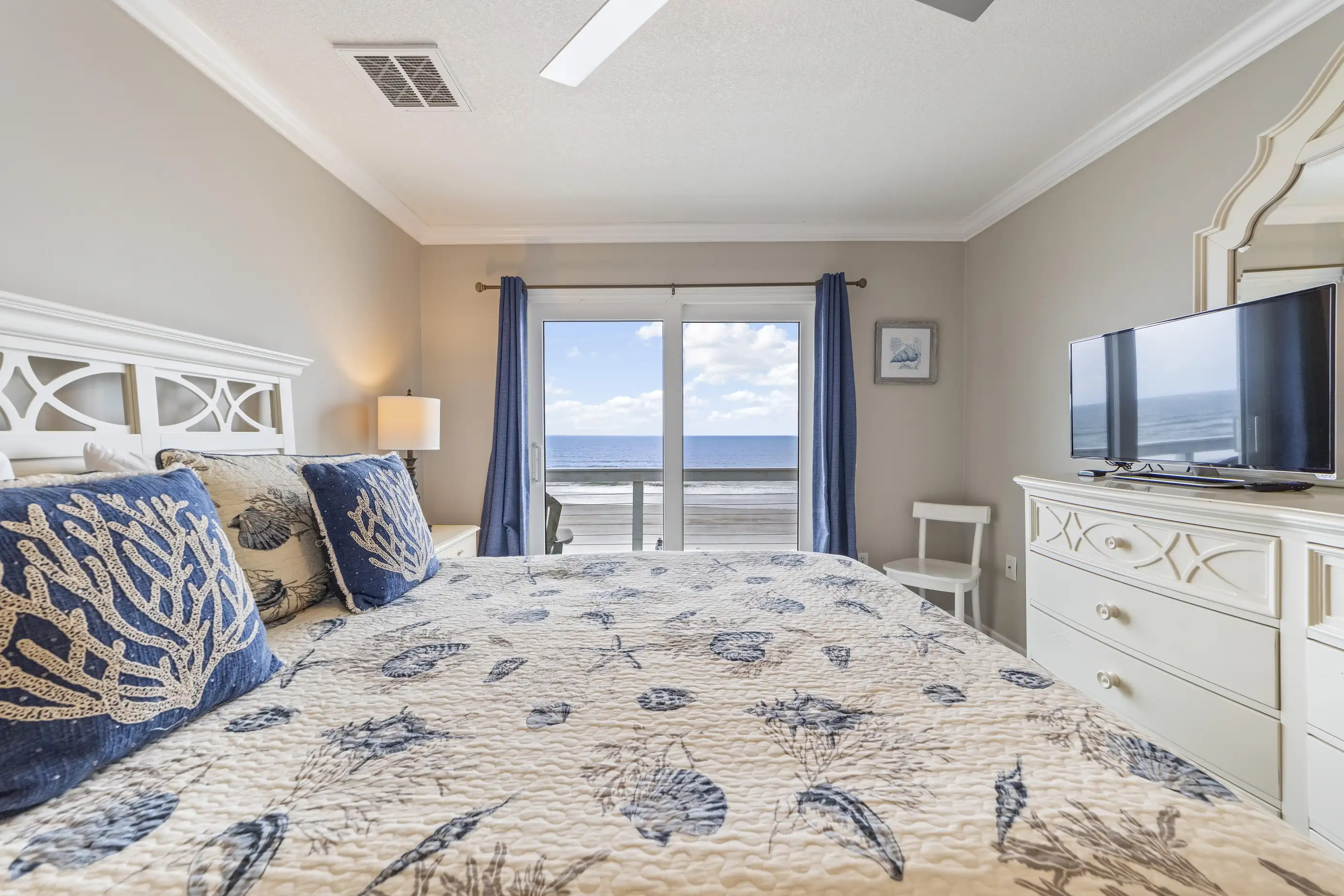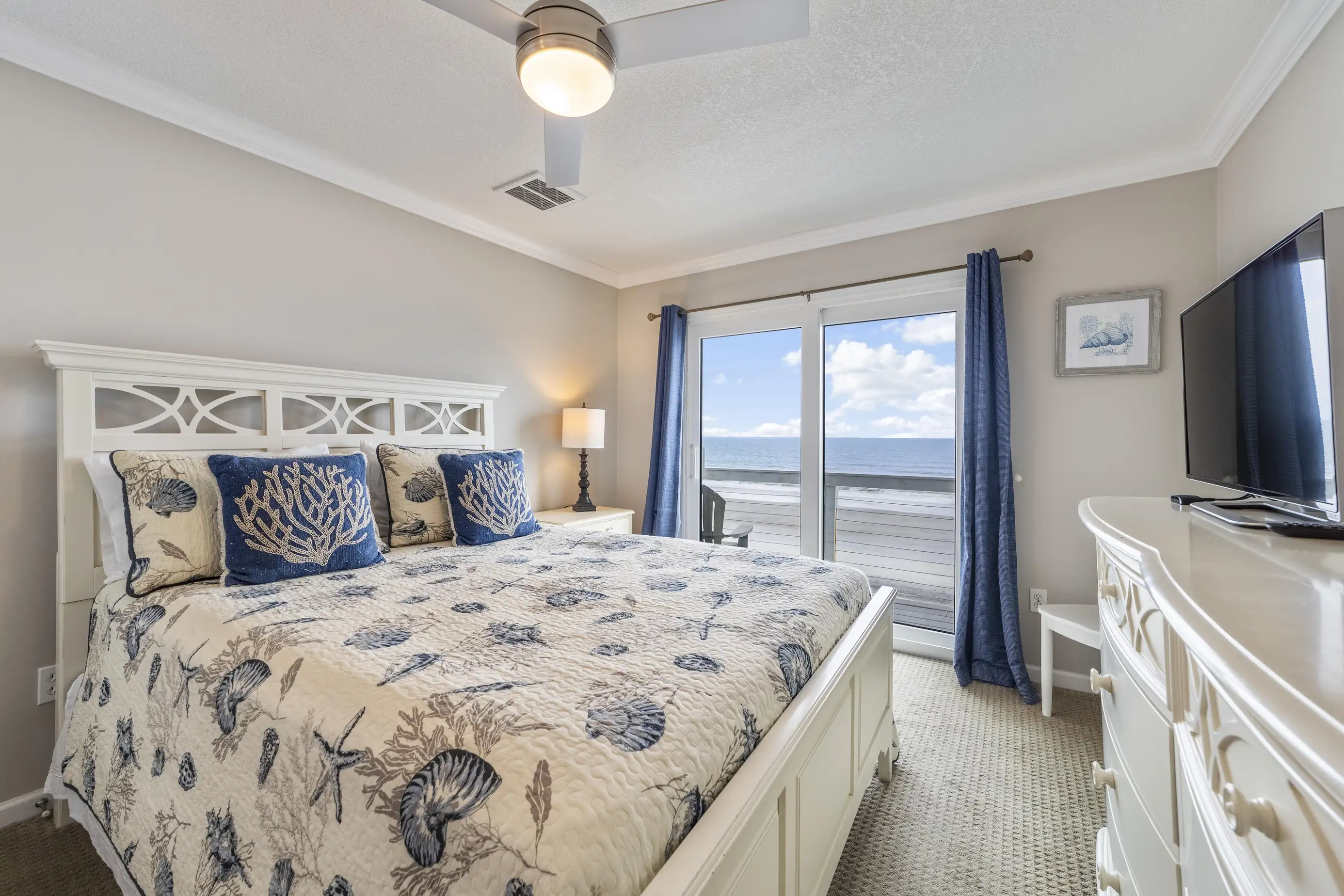 The townhome features three levels: a garage/foyer, the main living area, and all bedrooms on the third level. The master bedroom boasts a comfortable king-size bed with stunning ocean views and includes a full bathroom with a spacious two-sink vanity, a luxury walk-in shower, and a walk-in closet. The two guest queen bedrooms share a hall bathroom. Both the master bedroom and one guest queen bedroom feature private oceanfront balconies where you can relax and enjoy your favorite book. Each bedroom is equipped with flat-screen televisions that include Roku for streaming any must-see shows.