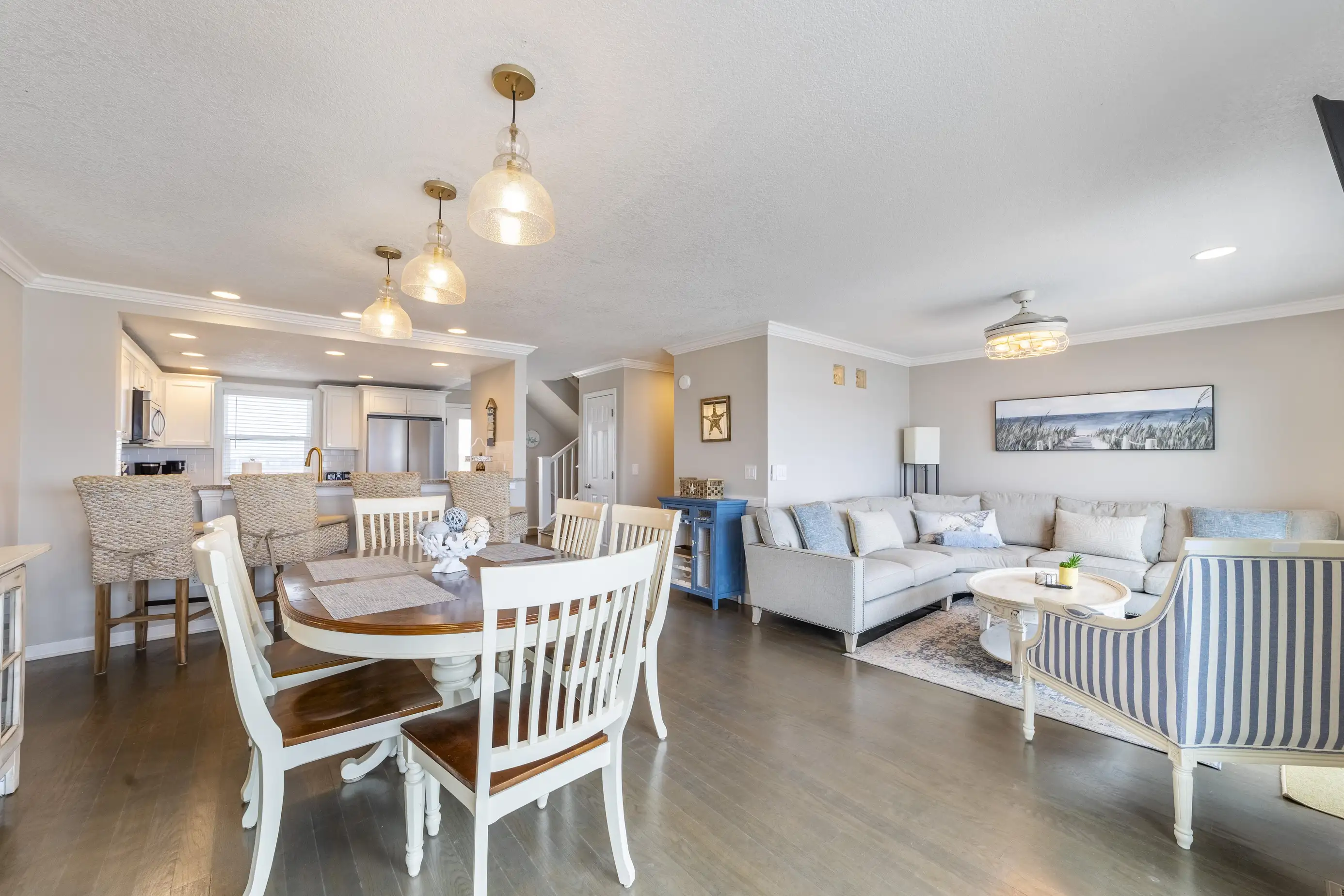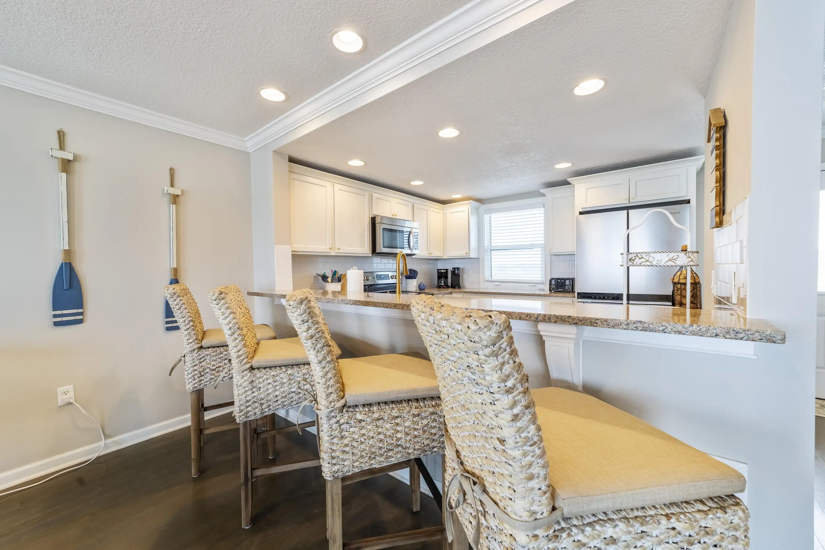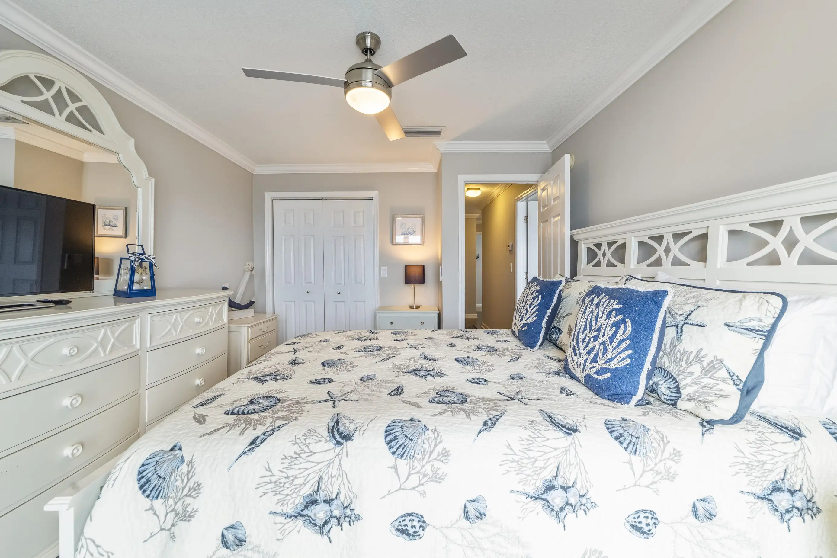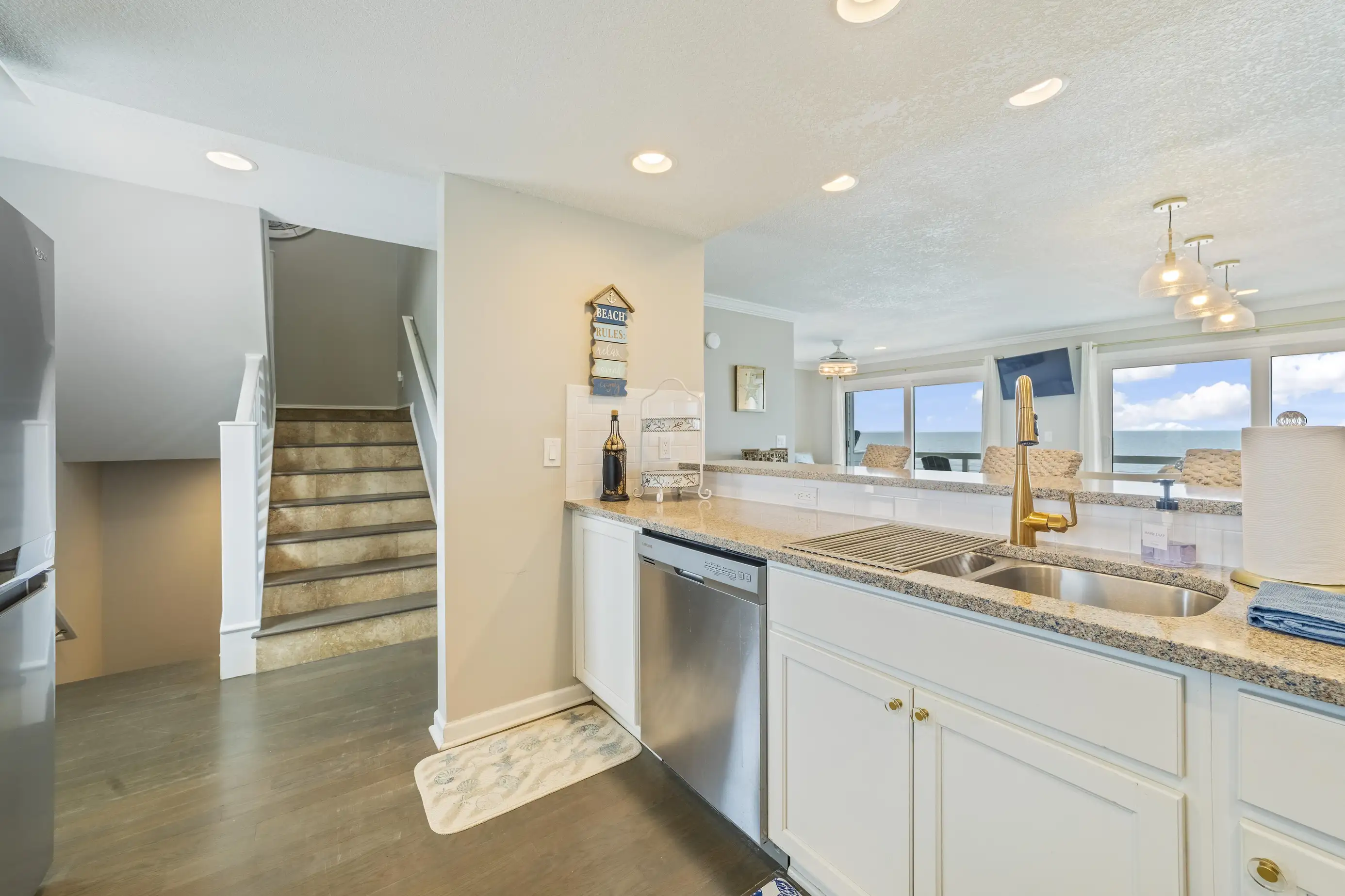 The townhome features three levels: a garage/foyer, the main living area, and all bedrooms on the third level. The master bedroom boasts a comfortable king-size bed with stunning ocean views and includes a full bathroom with a spacious two-sink vanity, a luxury walk-in shower, and a walk-in closet. The two guest queen bedrooms share a hall bathroom. Both the master bedroom and one guest queen bedroom feature private oceanfront balconies where you can relax and enjoy your favorite book. Each bedroom is equipped with flat-screen televisions that include Roku for streaming any must-see shows.