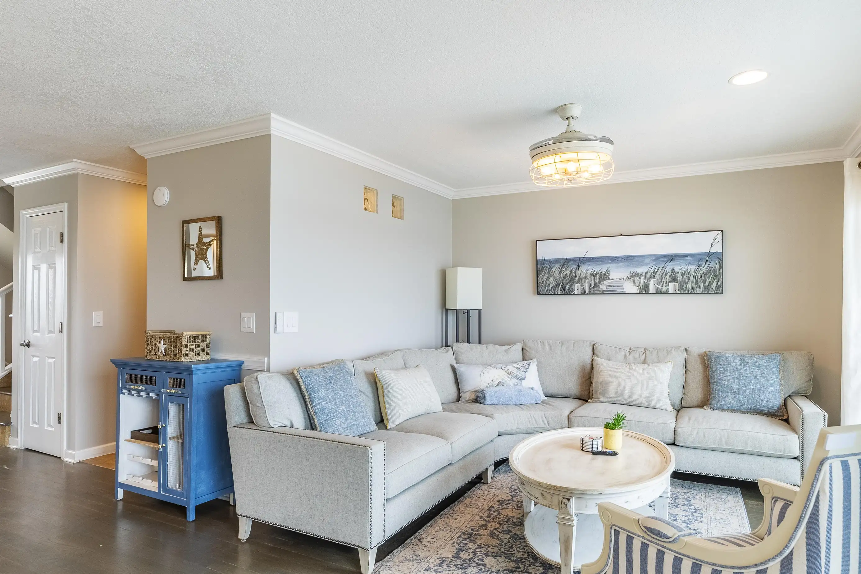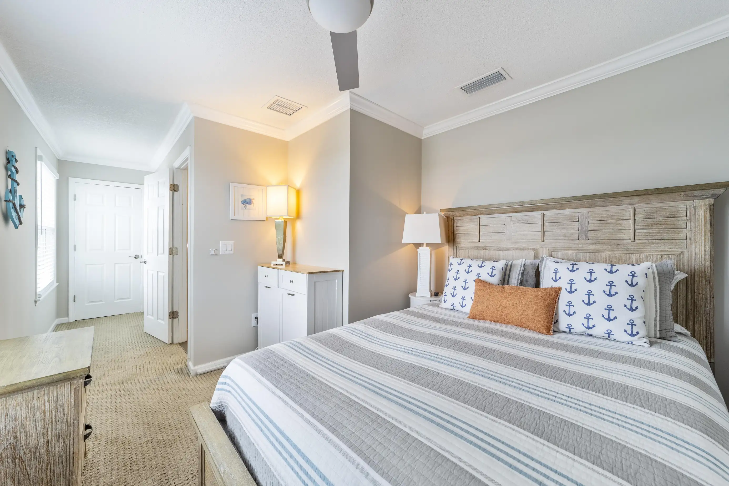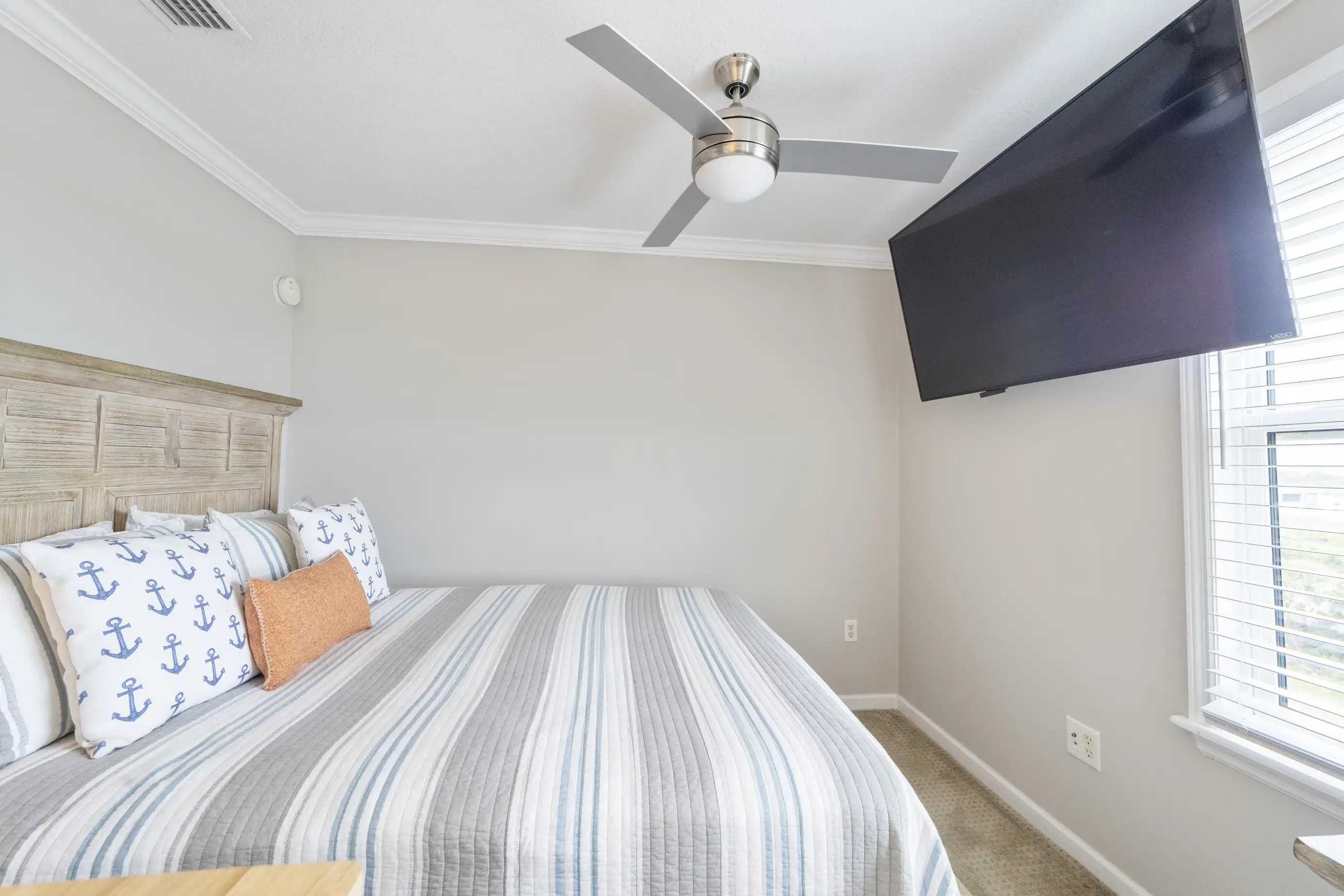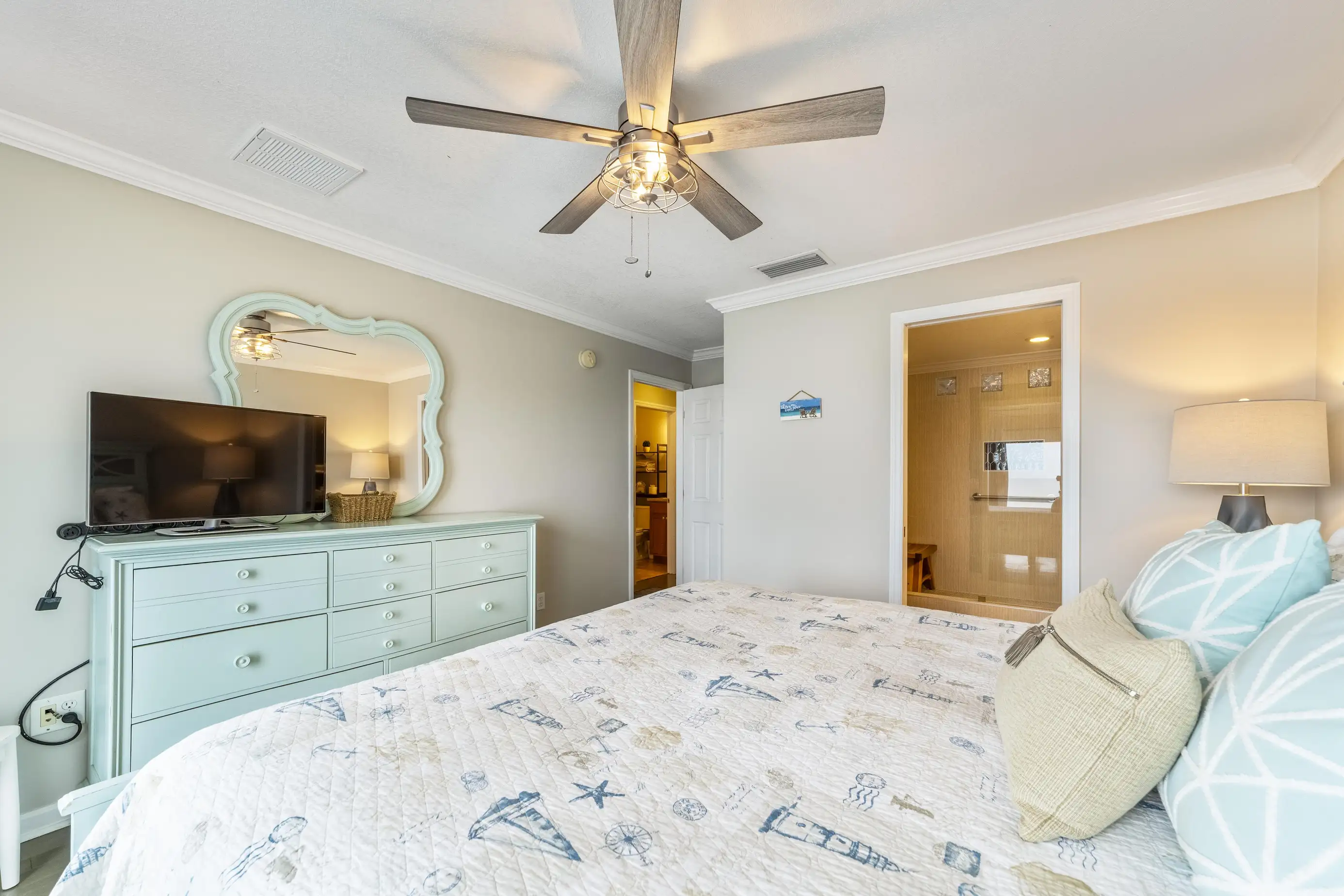The townhome features three levels: a garage/foyer, the main living area, and all bedrooms on the third level. The master bedroom boasts a comfortable king-size bed with stunning ocean views and includes a full bathroom with a spacious two-sink vanity, a luxury walk-in shower, and a walk-in closet. The two guest queen bedrooms share a hall bathroom. Both the master bedroom and one guest queen bedroom feature private oceanfront balconies where you can relax and enjoy your favorite book. Each bedroom is equipped with flat-screen televisions that include Roku for streaming any must-see shows.
