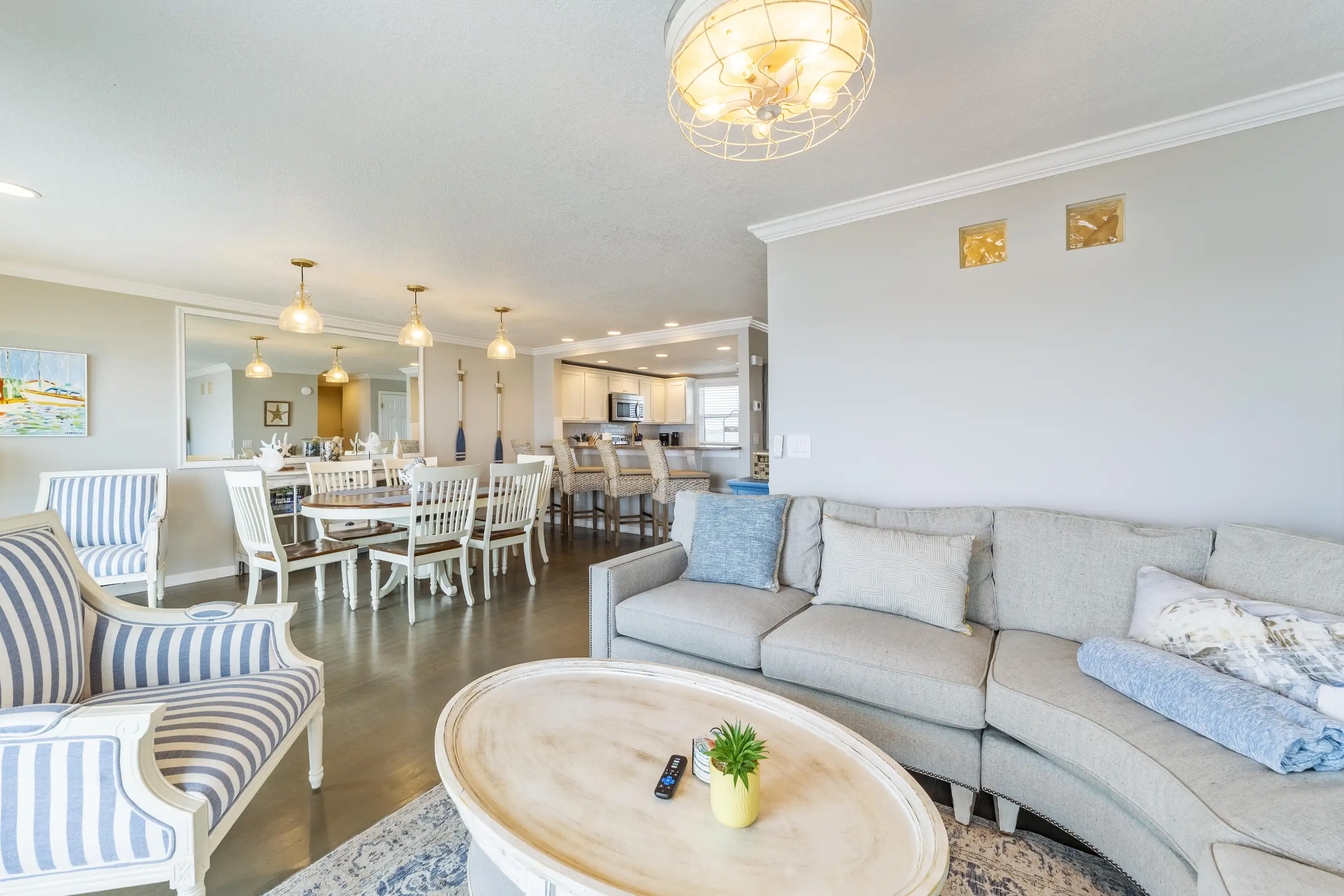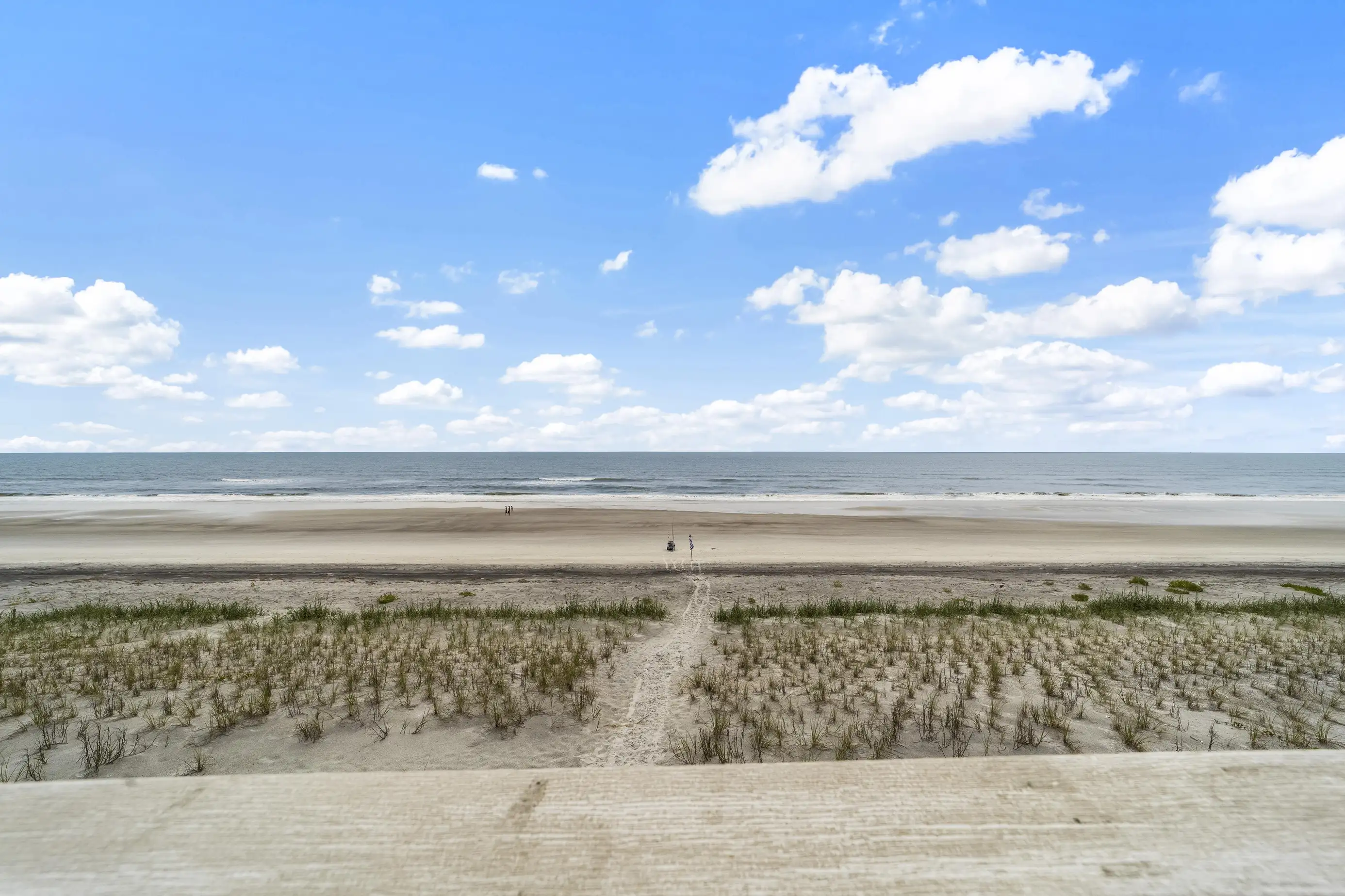 The main living area showcases fantastic beach views and includes a fully equipped gourmet kitchen, family room, dining area, half bath, laundry room, and a balcony overlooking the Atlantic Ocean. The gourmet kitchen is outfitted with stainless steel appliances, pots and pans, dishes, a blender, a Keurig coffee maker, a regular coffee maker, serving ware, and all the essential equipment you need for preparing home-cooked meals. The family room offers ample seating with a couch and a full-size sofa sleeper. The laundry room is equipped with a full-size washer and dryer. A six-piece dining set, along with four bar stools, is ready for your family dinners. The main floor balcony provides an inviting seating area.