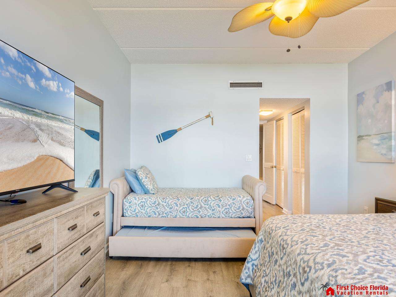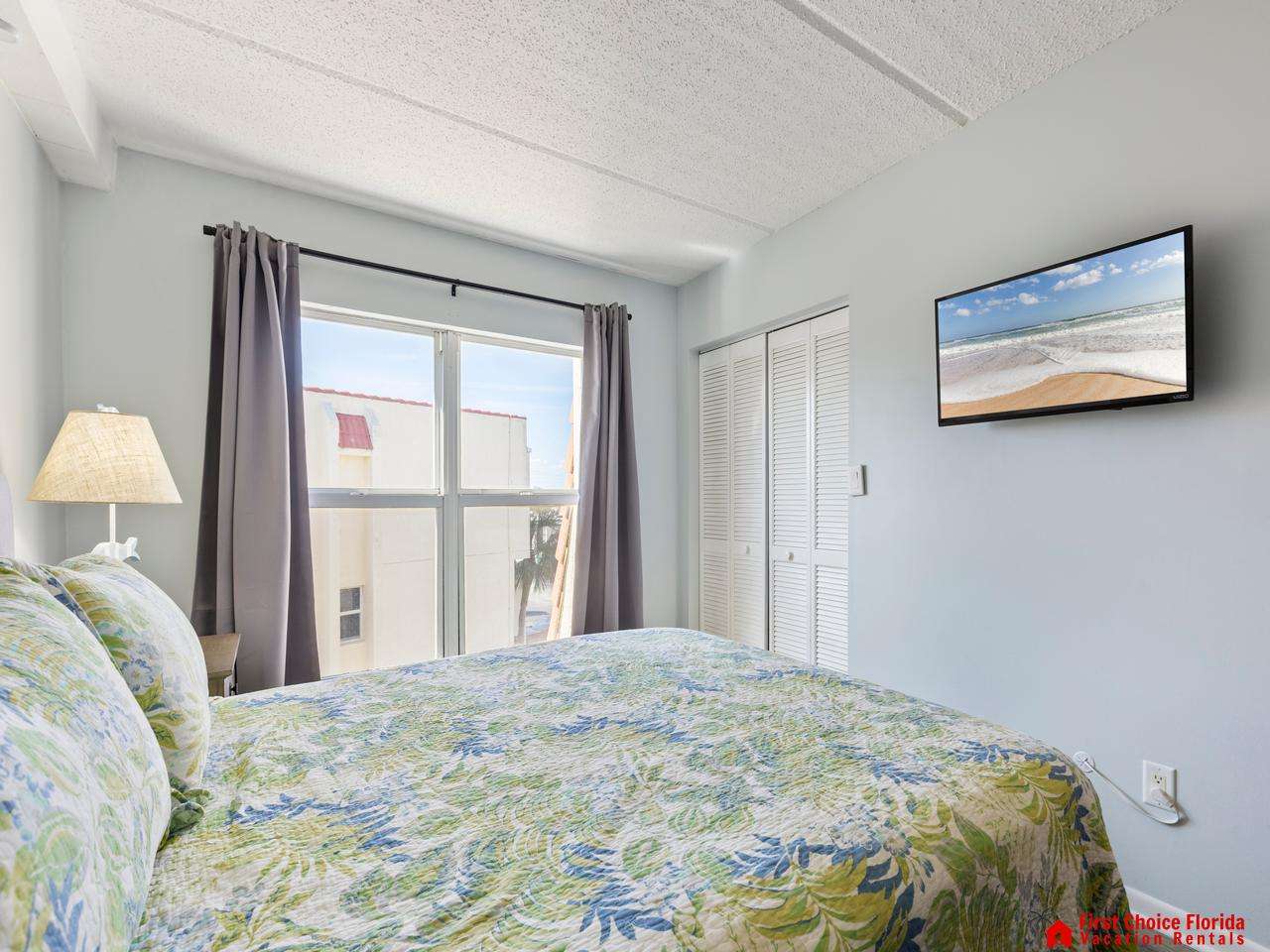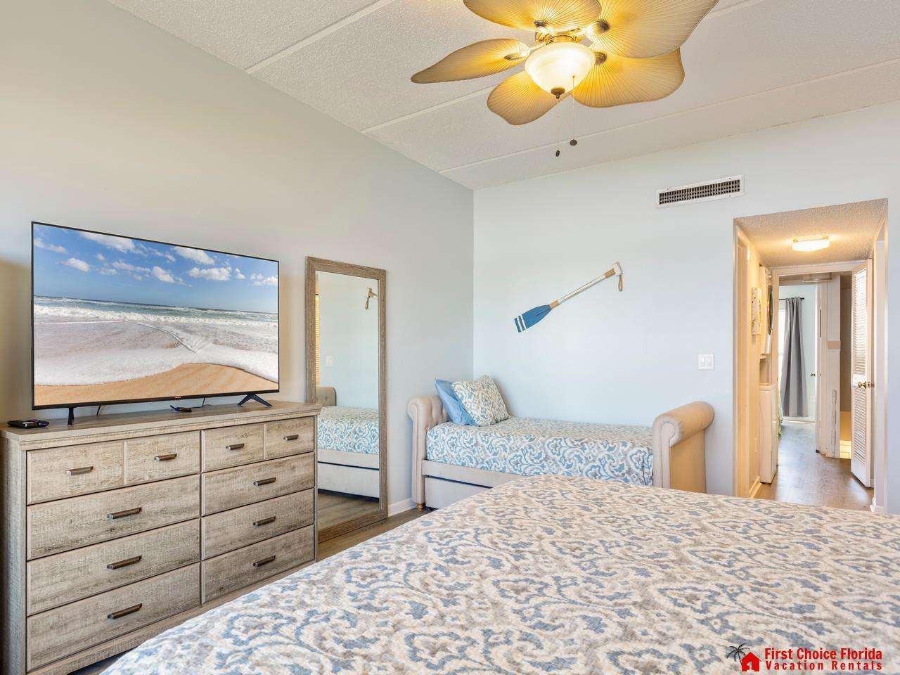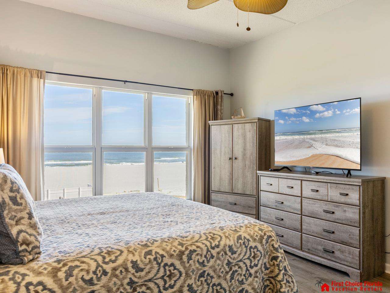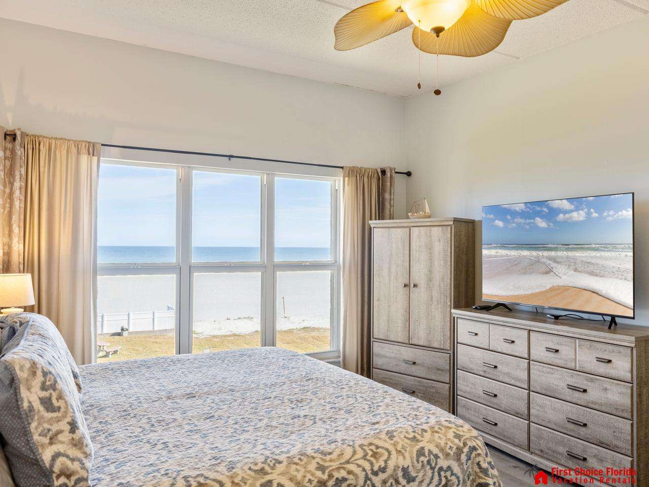 The master suite is complete with a king sized bed, TV, and bathroom with a walk in shower. Watch the sunrise from your bed every morning!