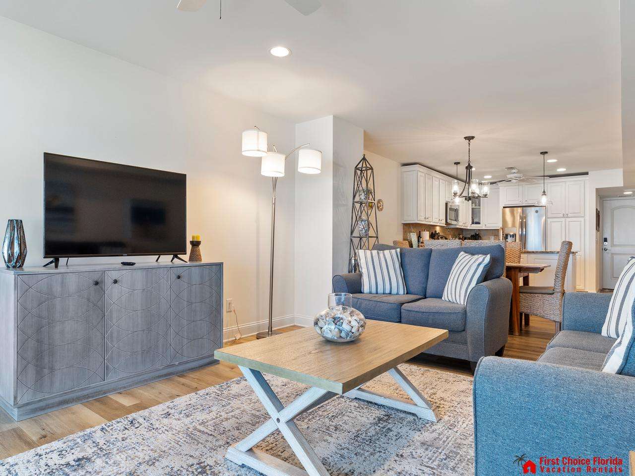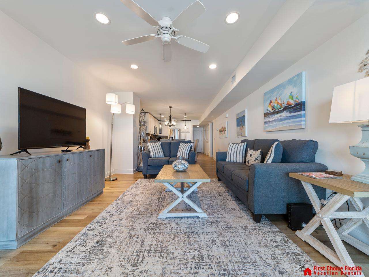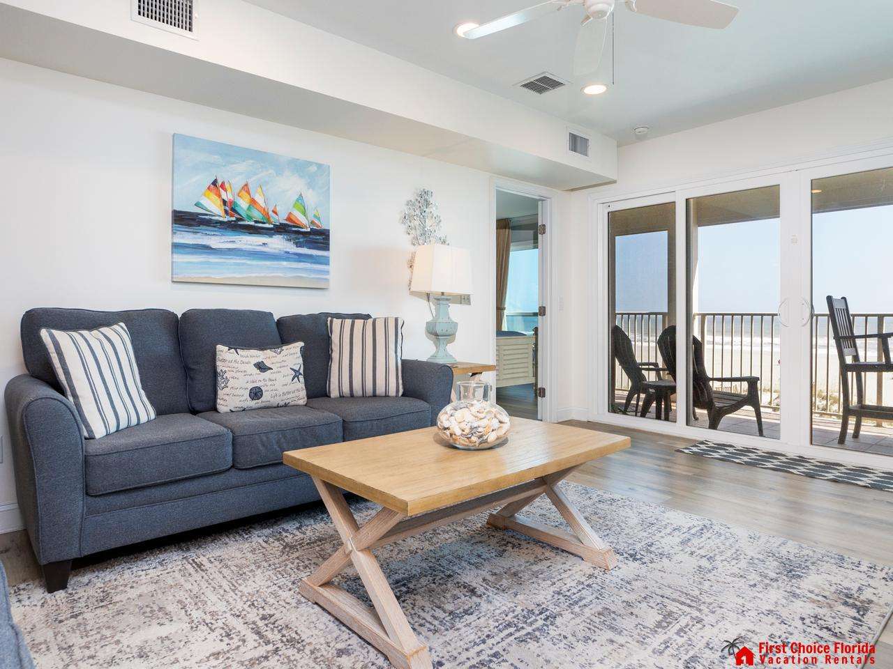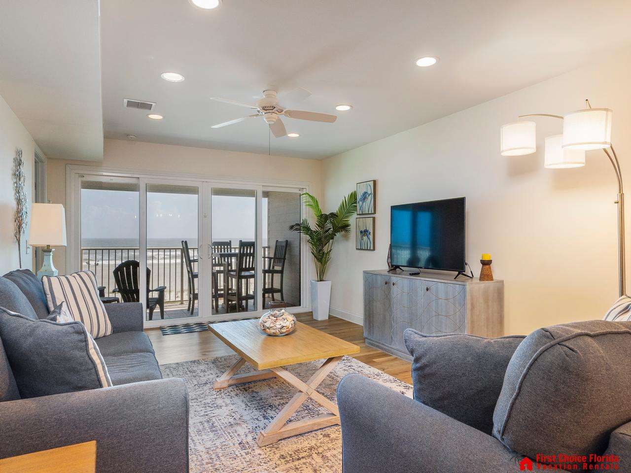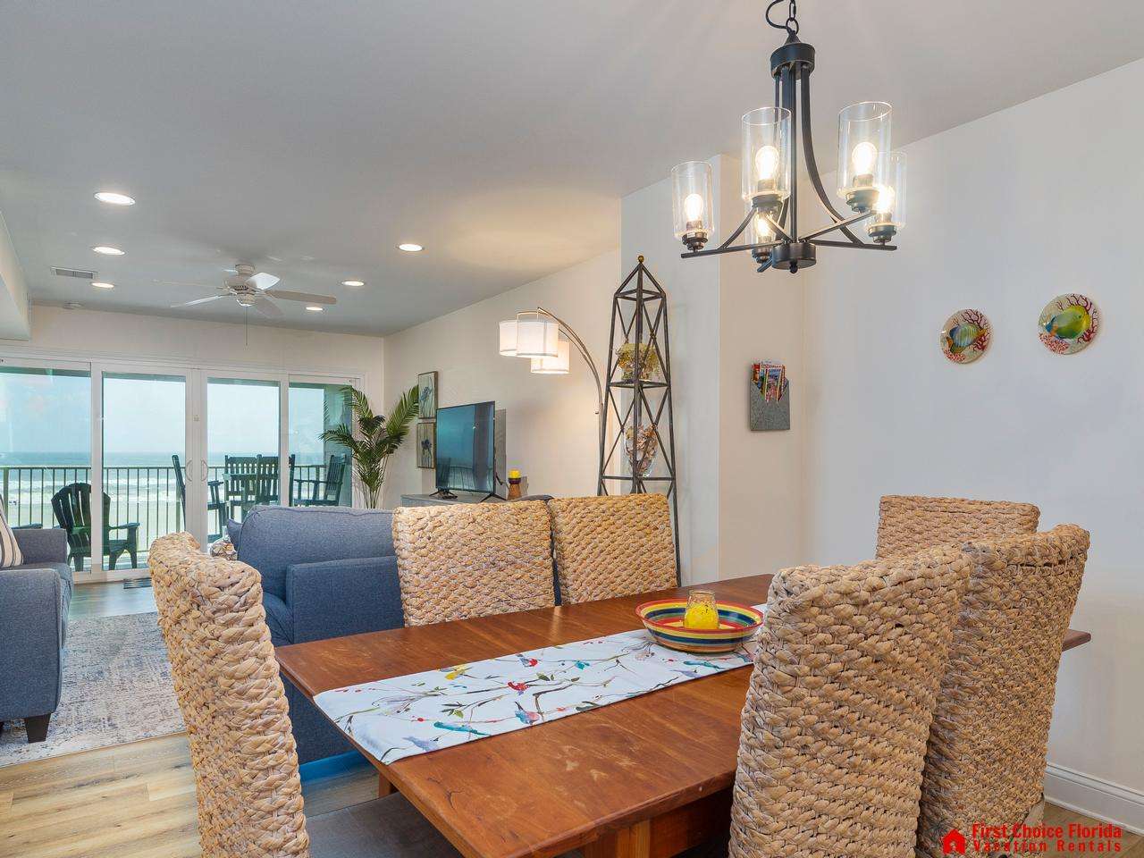 The family room offers views of the Atlantic Ocean, with comfy couches and the soothing sound of waves—perfect for relaxation. Enjoy your favorite programs on the large flat-screen TV at night.