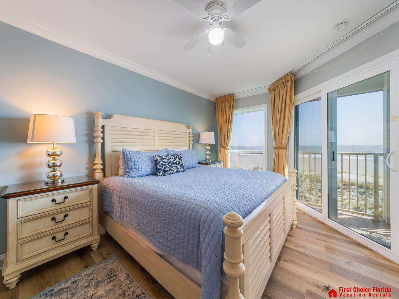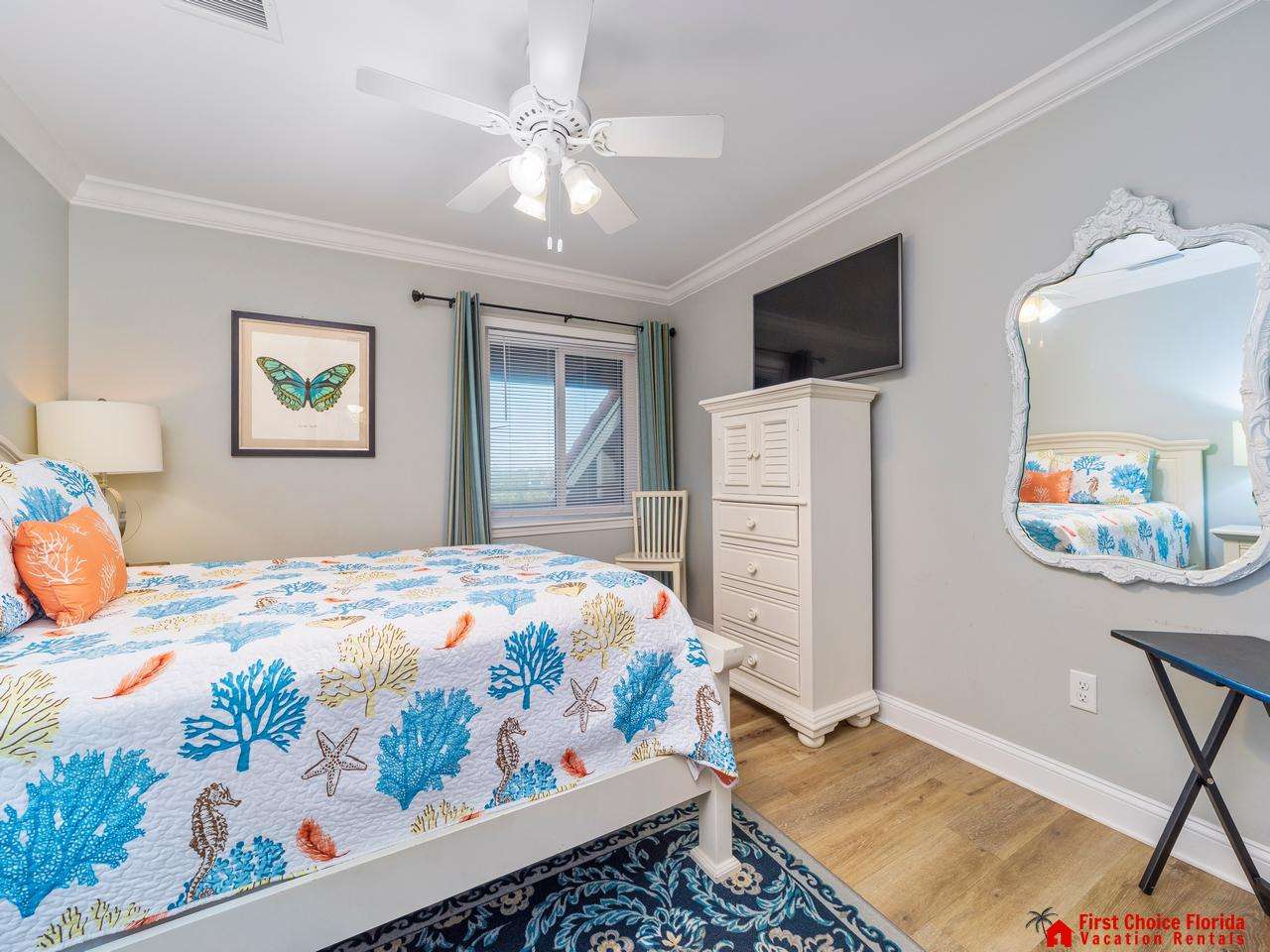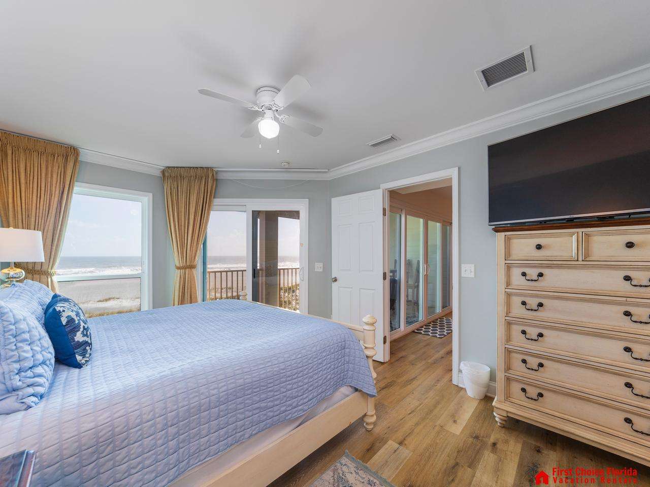 The primary suite features a king bed, a TV, and a bathroom with a huge shower, vanity, and a water closet. Watch the sunrise from your bed!