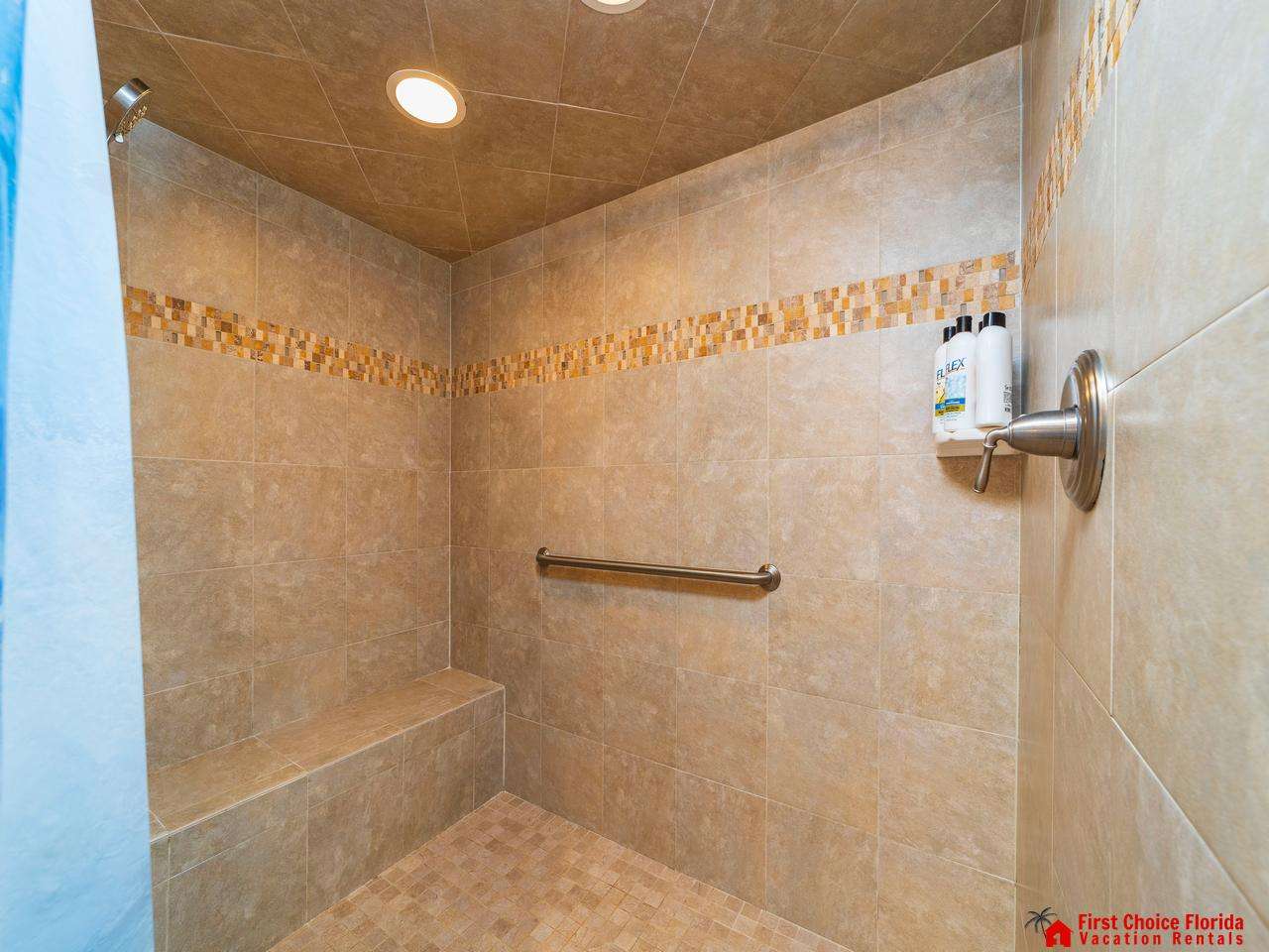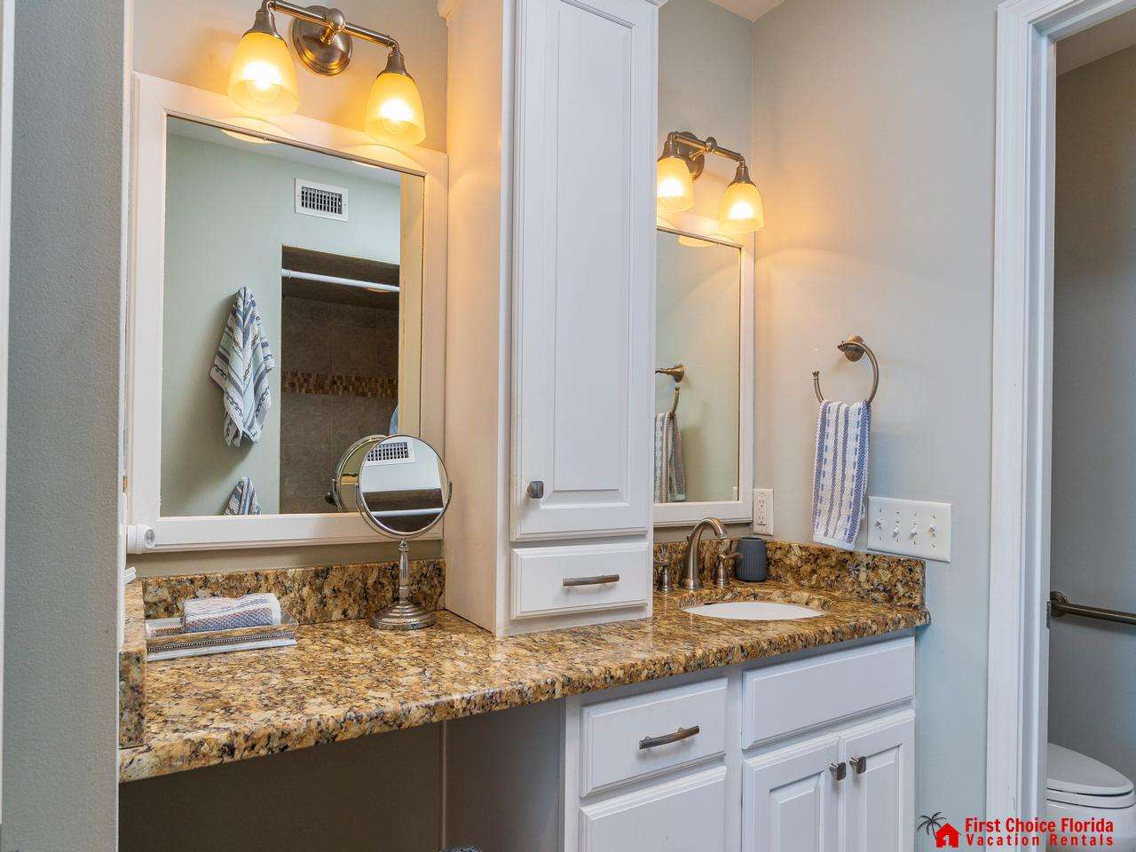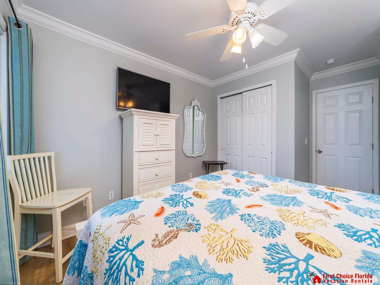The primary suite features a king bed, a TV, and a bathroom with a huge shower, vanity, and a water closet. Watch the sunrise from your bed!