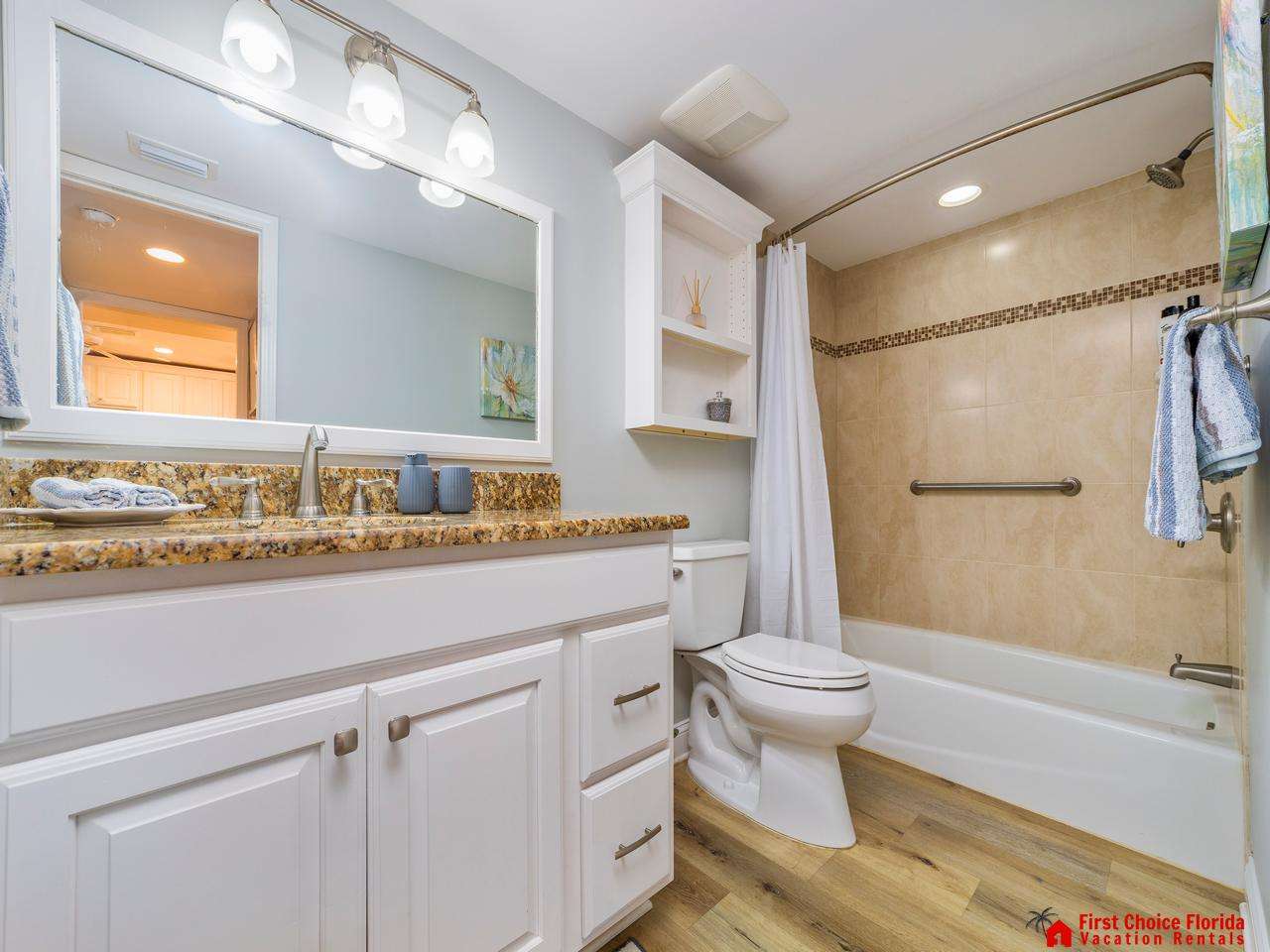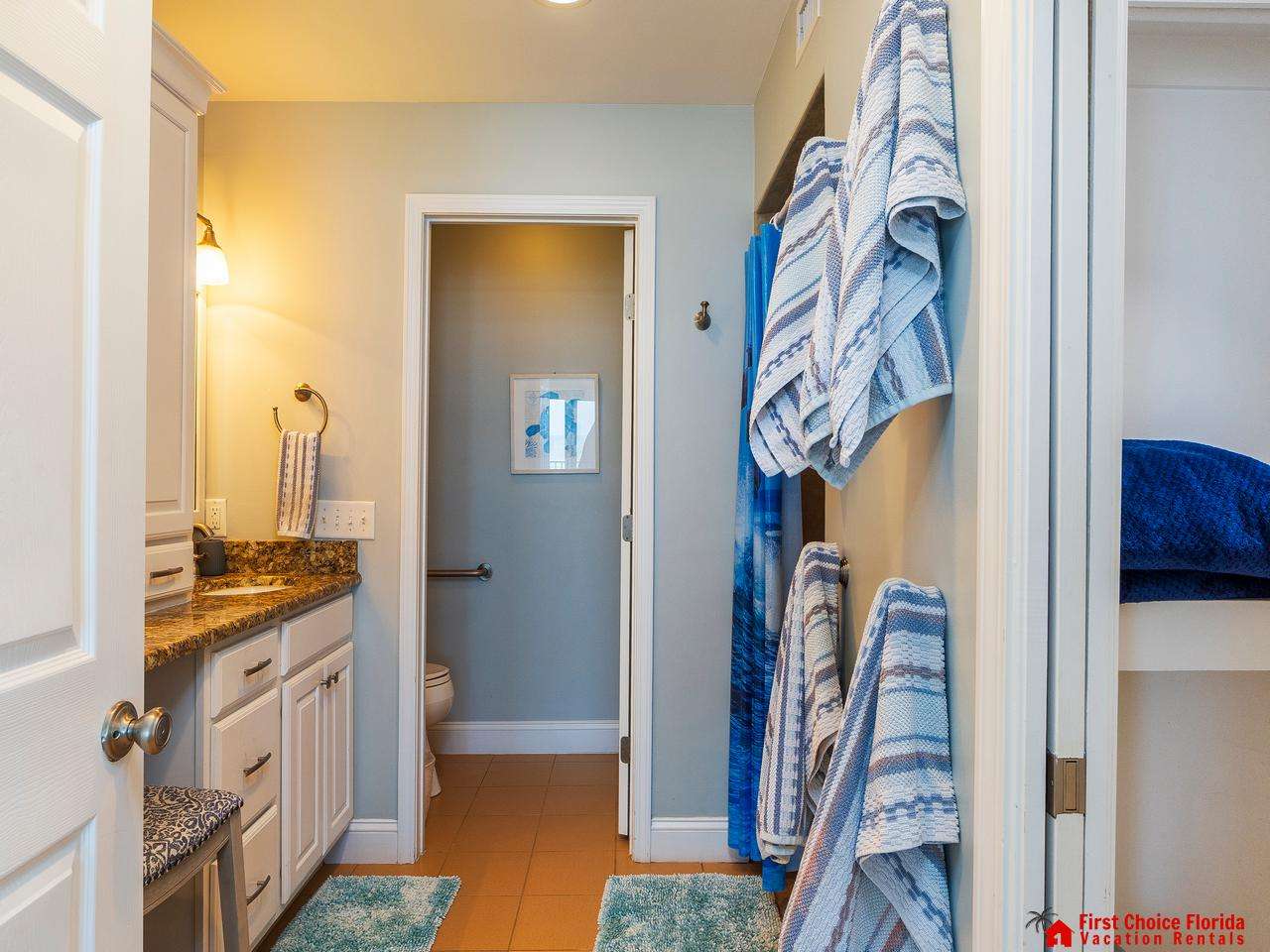 The second bedroom has a queen bed, and the third includes a twin bed. The guest bedrooms share a renovated bathroom with a tub/shower and toilet.